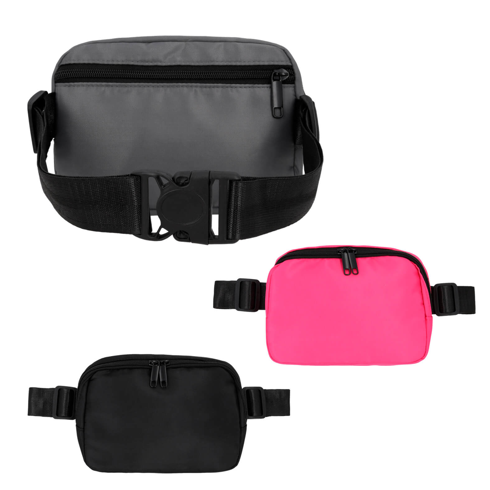 cangurera de doble cierre con 1 compartimento principal y bolsa interna, 1 compartimento trasero, correa de doble ajuste con broche de seguridad.