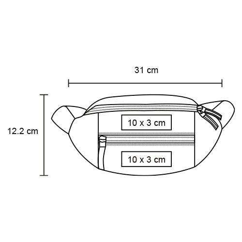 cangurera antirreflejante que incluye, 1 compartimento principal con compartimento interno, 1 compartimento frontal, correa ajustable y broche de seguridad.