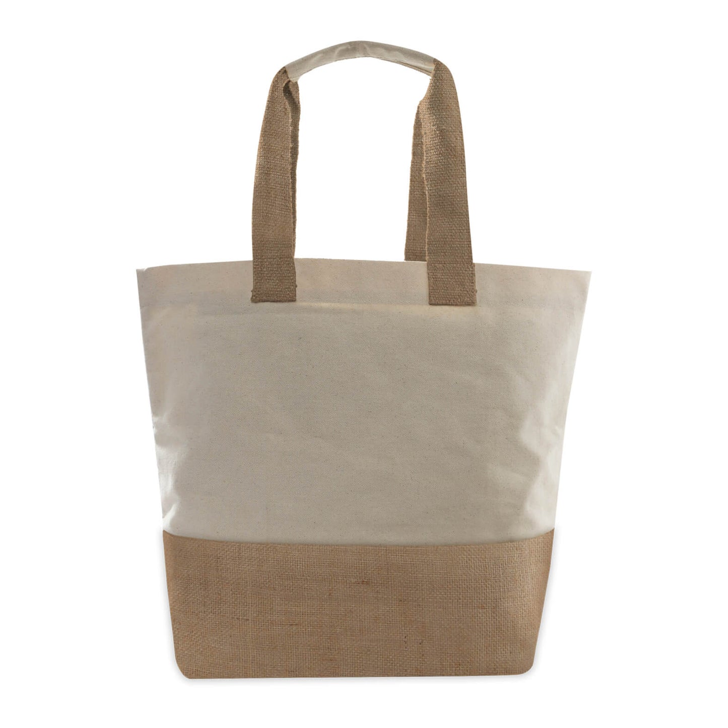 bolsa de algodón cosida con yute en la parte inferior y asas.
