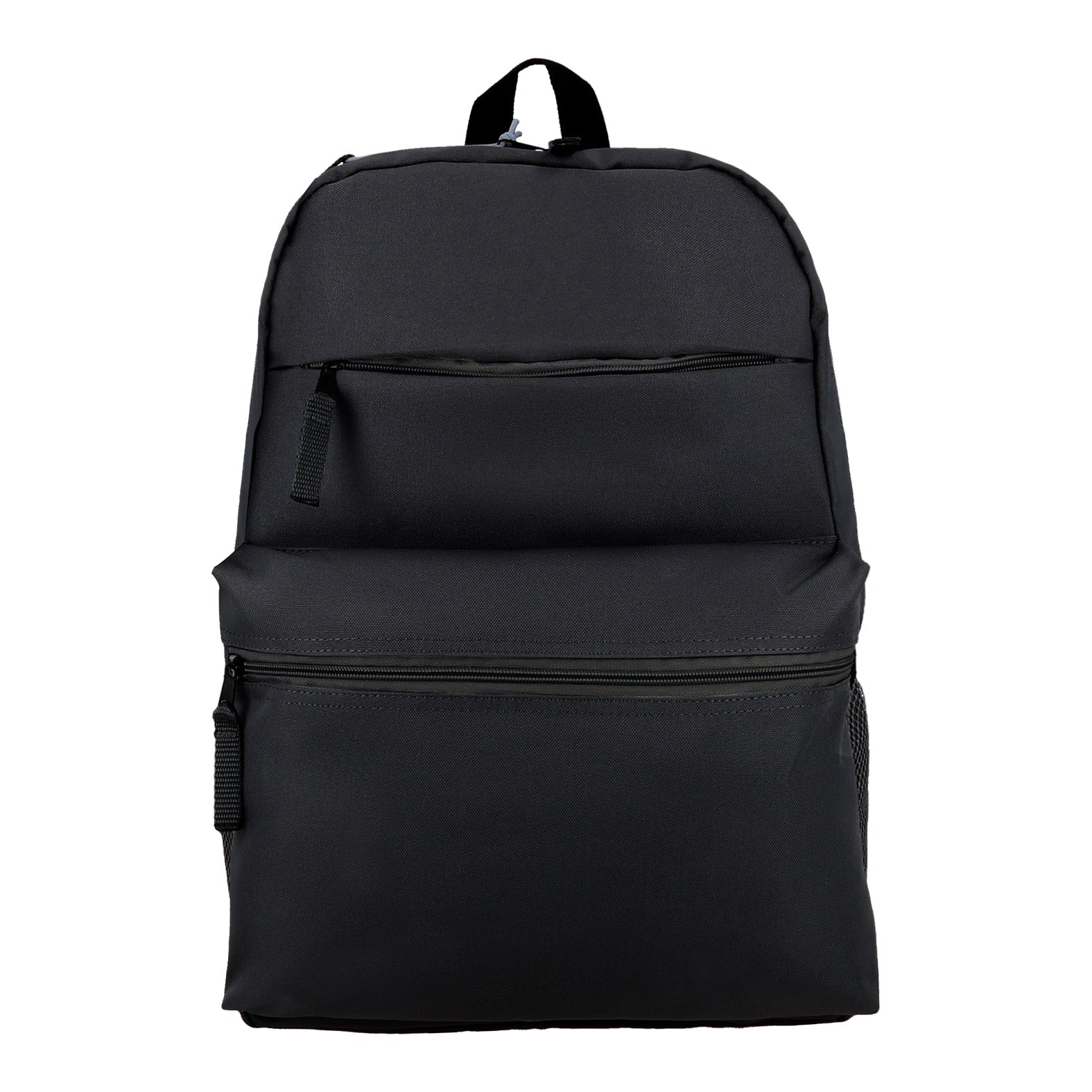 mochila con 3 compartimentos, 1 compartimento principal 2 compartimentos frontales, 2 mallas laterales, respaldo, tirantes acolchaos y asa superior.