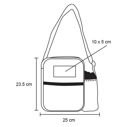 bolsa de hombro con 1 compartimento principal, 1 compartimento frontal de malla, 1 compartimento lateral y correa ajustable con broche de seguridad.