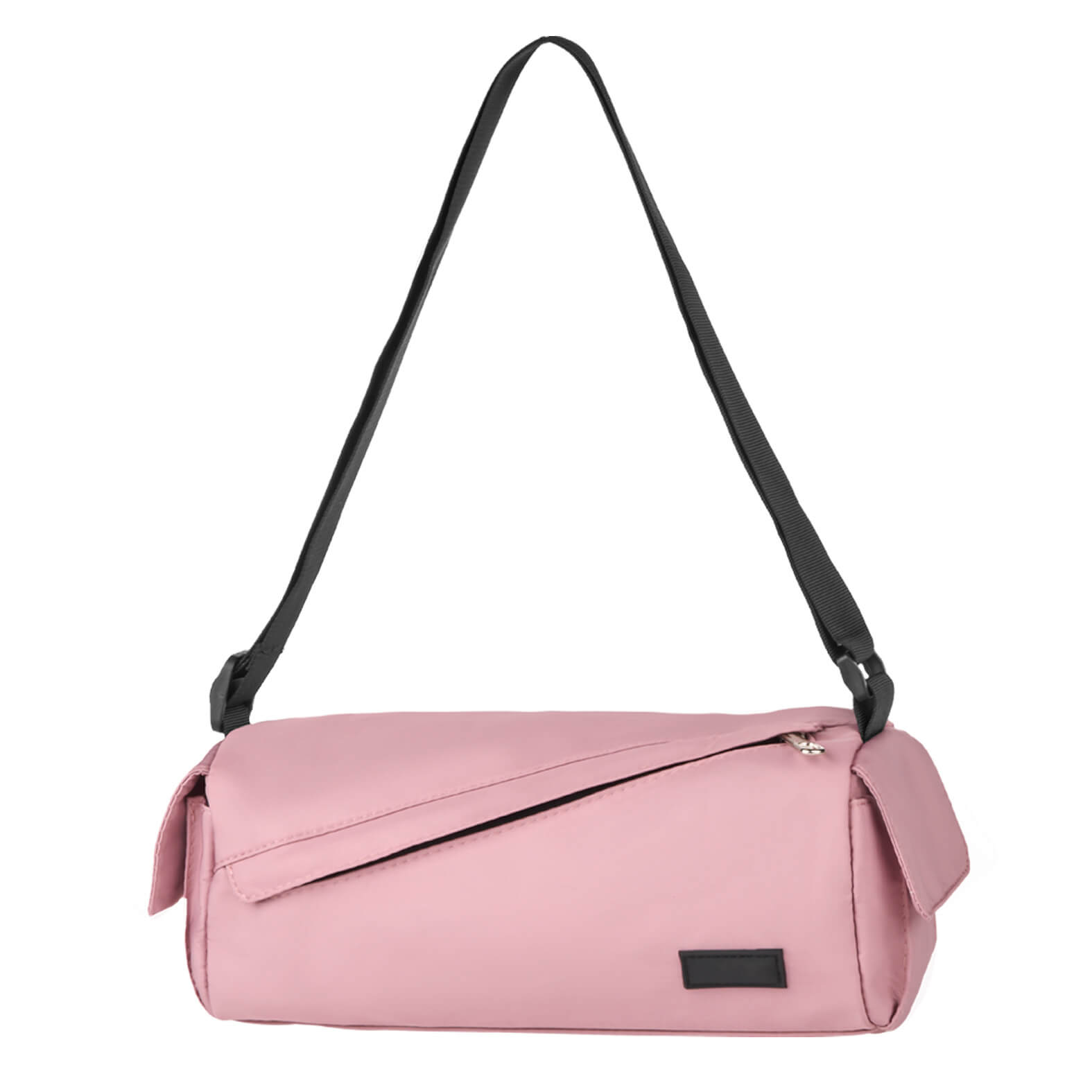 bolsa de hombro de poliéster con compartimento principal, bolsillo interno con cierre, dos bolsillos laterales y correa ajustable.