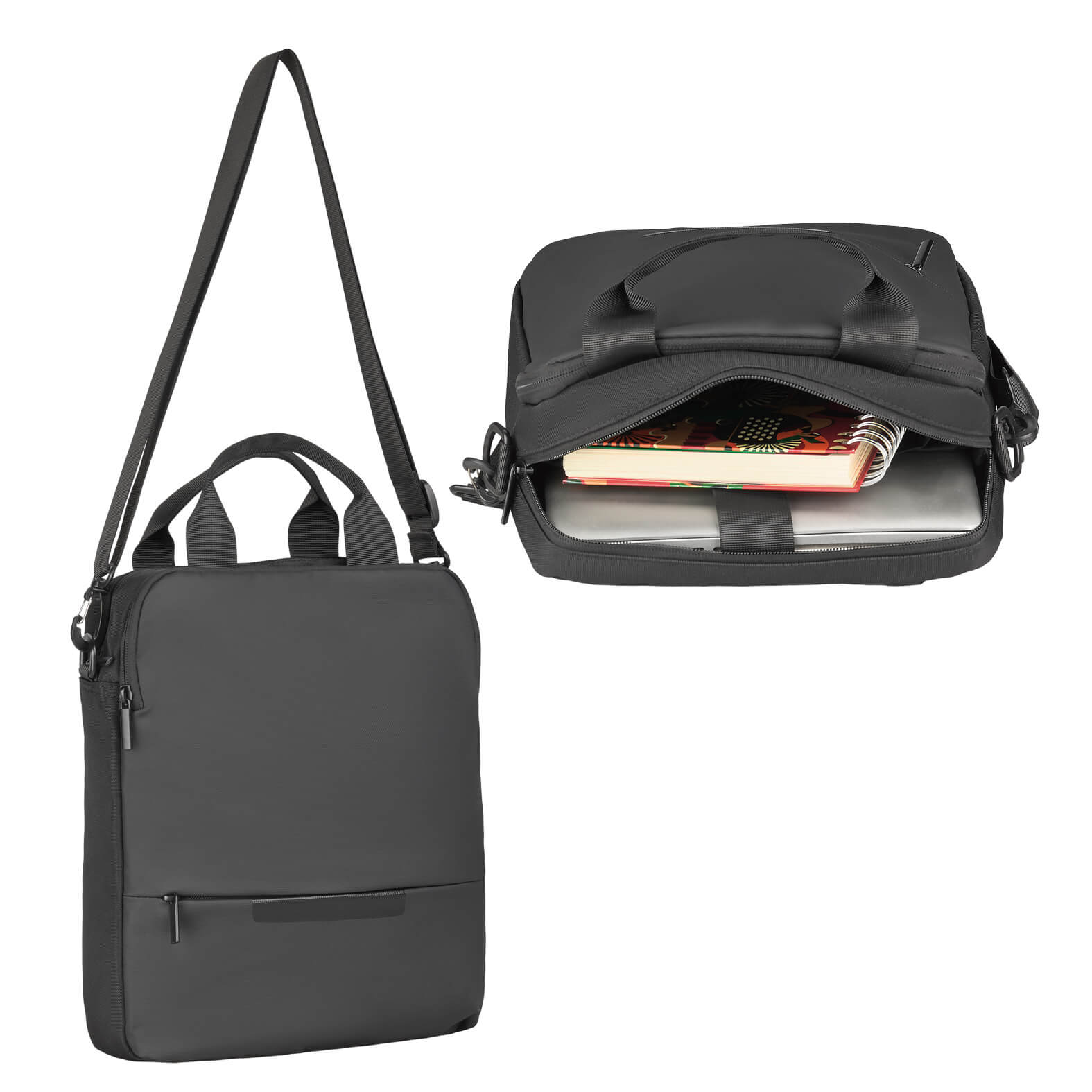 portafolio de poliéster con compartimento principal amplio y porta laptop de hasta 15", dos bolsillos frontales con cierre, bolsa trasera con cierre, asas y correa ajustable.
