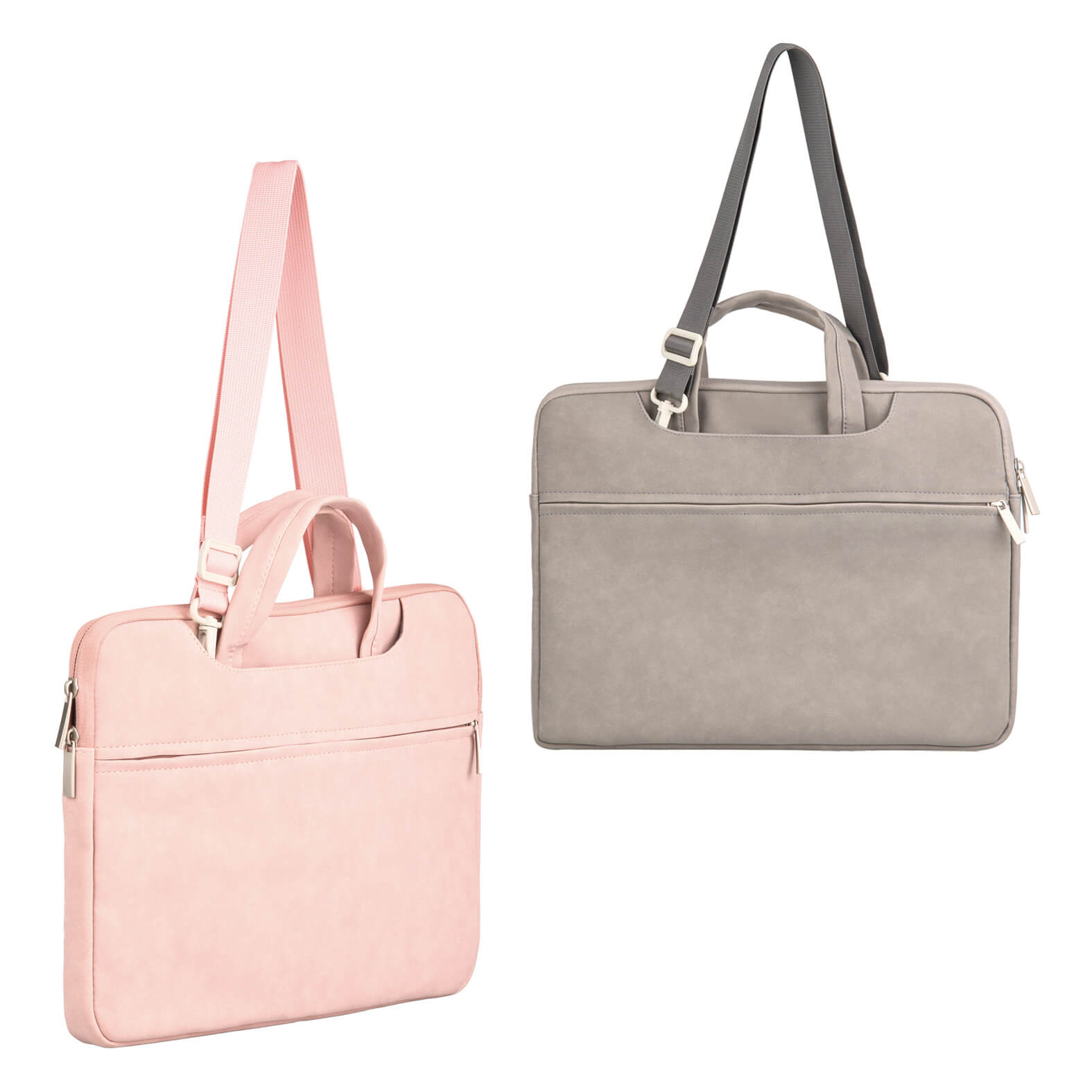 portafolio con compartimento principal afelpado para laptop de hasta 15", dos bolsillos para guardar las asas, bolsa frontal con cierre, banda carry-on y correa ajustable.