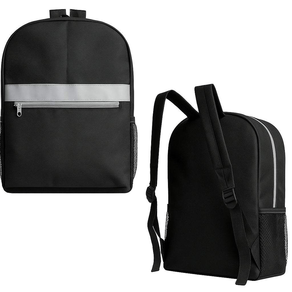 mochila con compartimento principal, bolsa frontal con cierre, dos mallas laterales, asa superior y correas ajustables.