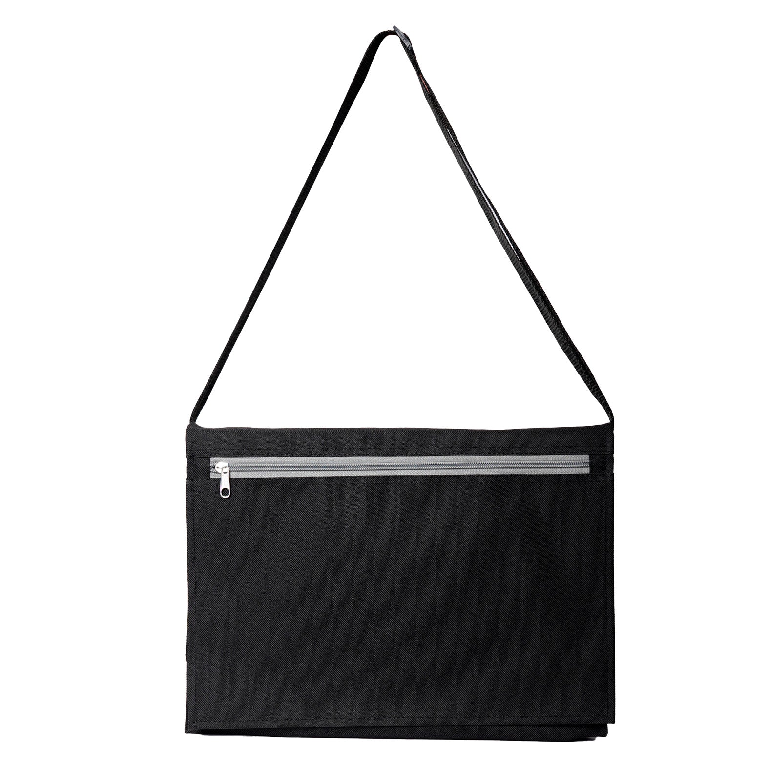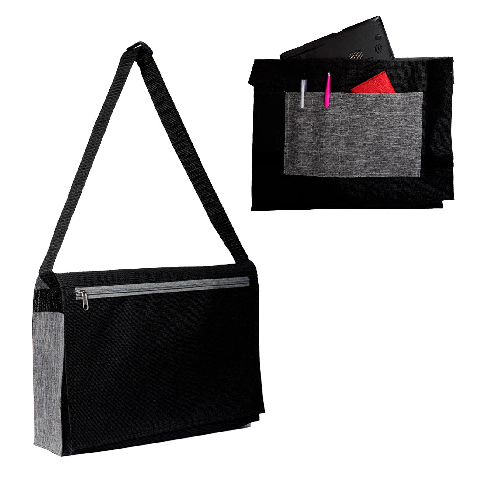portafolio con compartimento principal para laptop de hasta 15", organizador frontal, solapa con cierre de velcro, bolsa trasera con cierre y correa ajustable.
