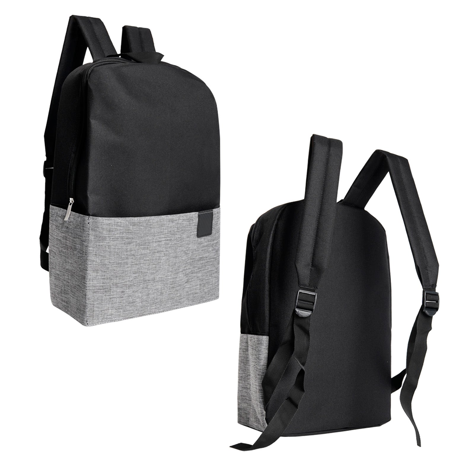 mochila con compartimento principal y porta laptop, bolsa frontal con cierre, asa superior y correas.