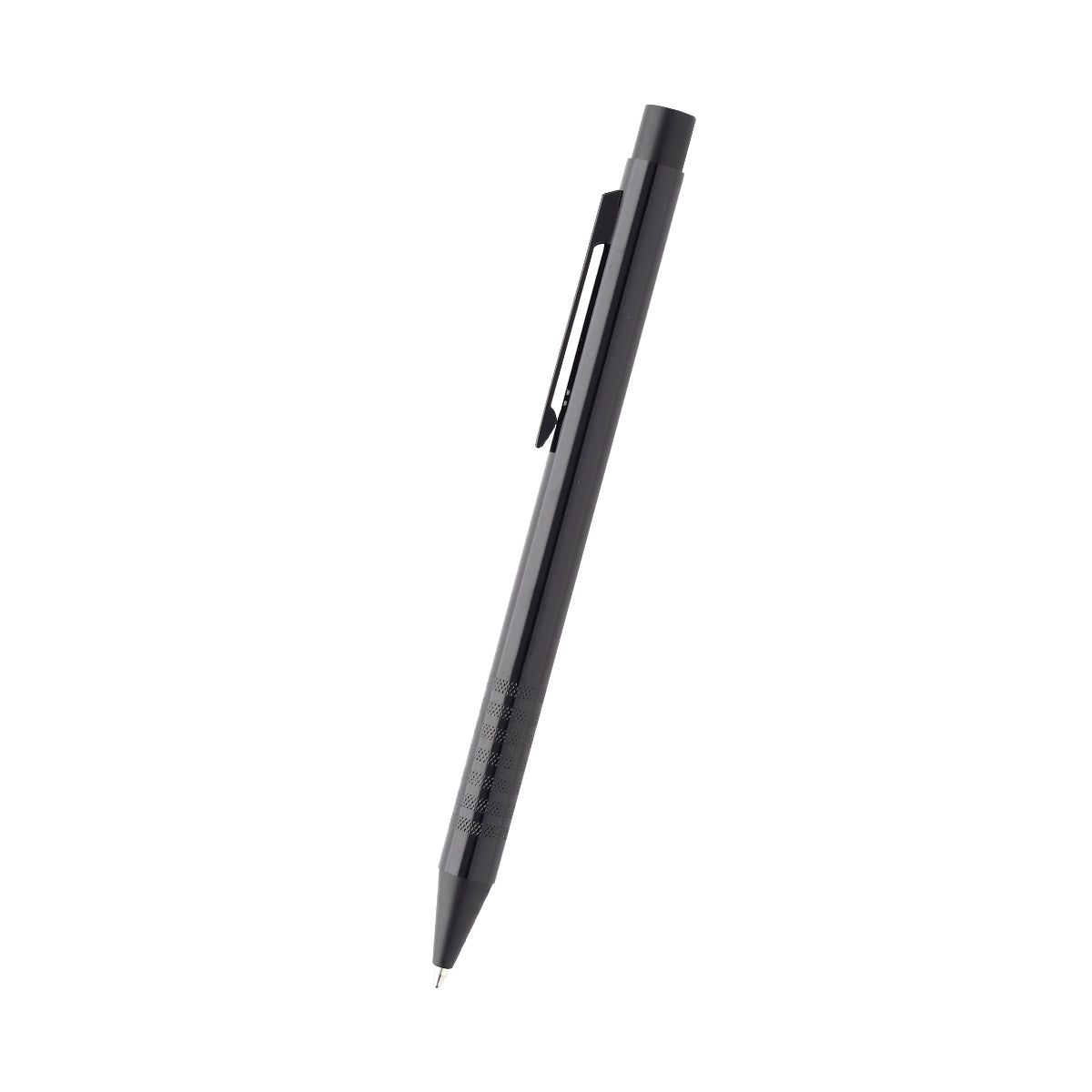 bolígrafo con barril de aluminio acabado brillante, botón de plástico y clip metálico. tinta de escritura azul.