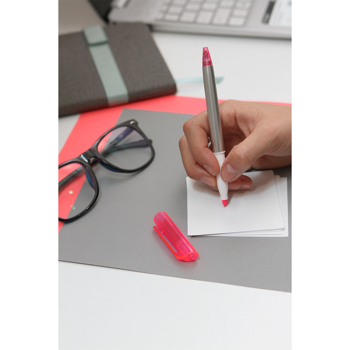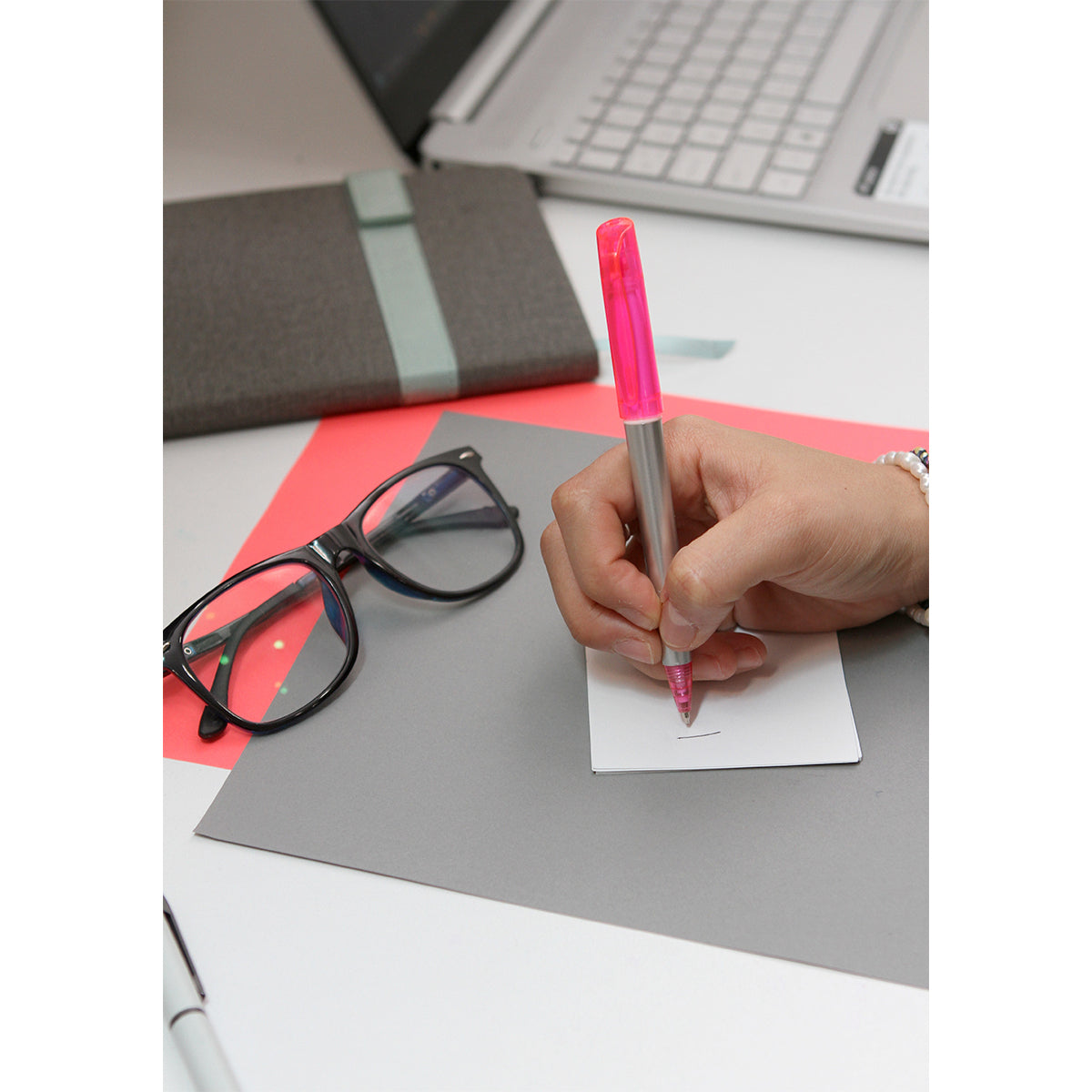 bolígrafo twist fabricado en abs (acrolonitrilo butadieno estireno), con apariencia metálica y marca textos con tapa de color translucida. tinta de escritura negra.