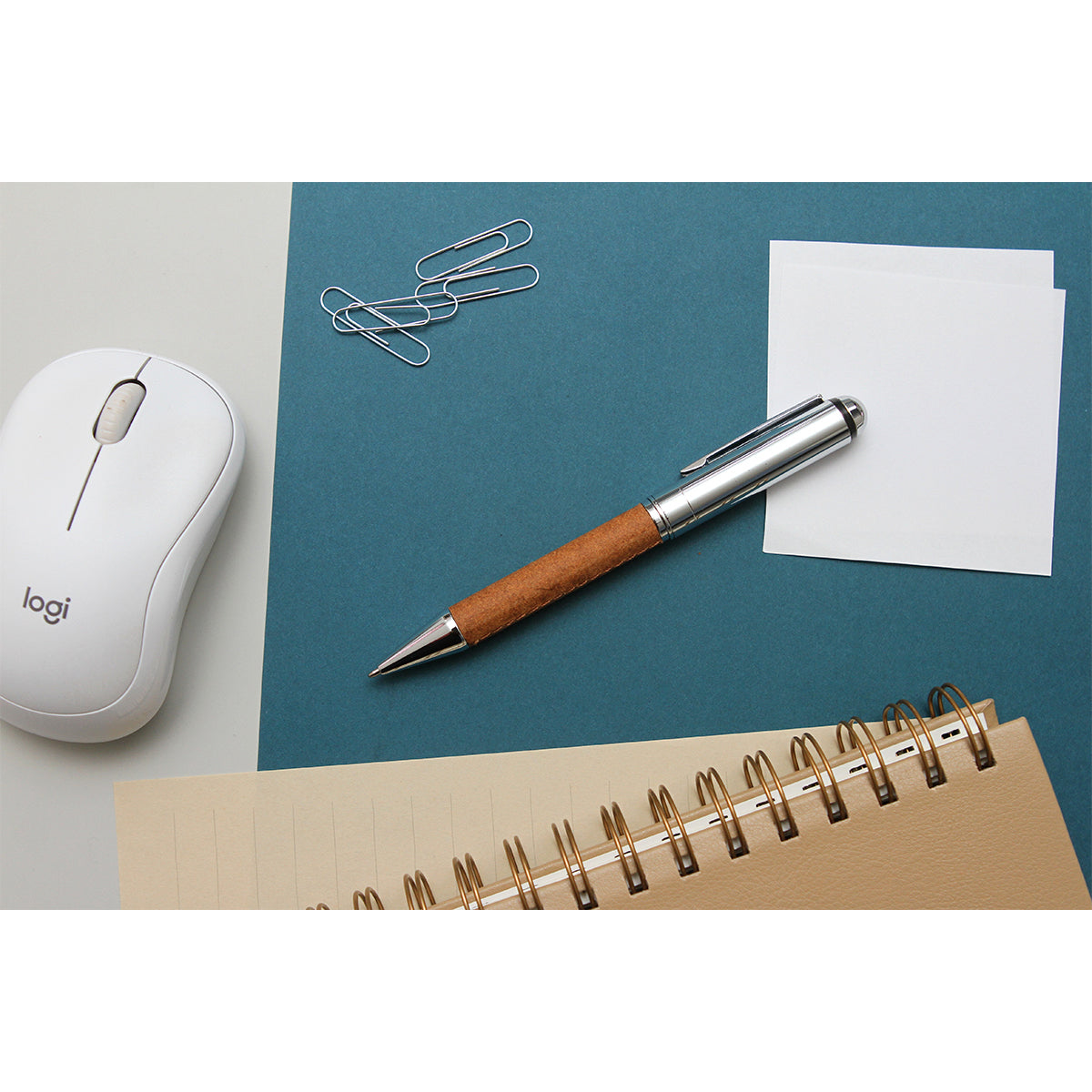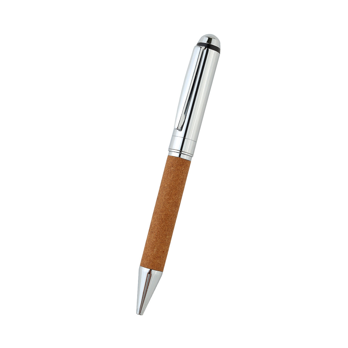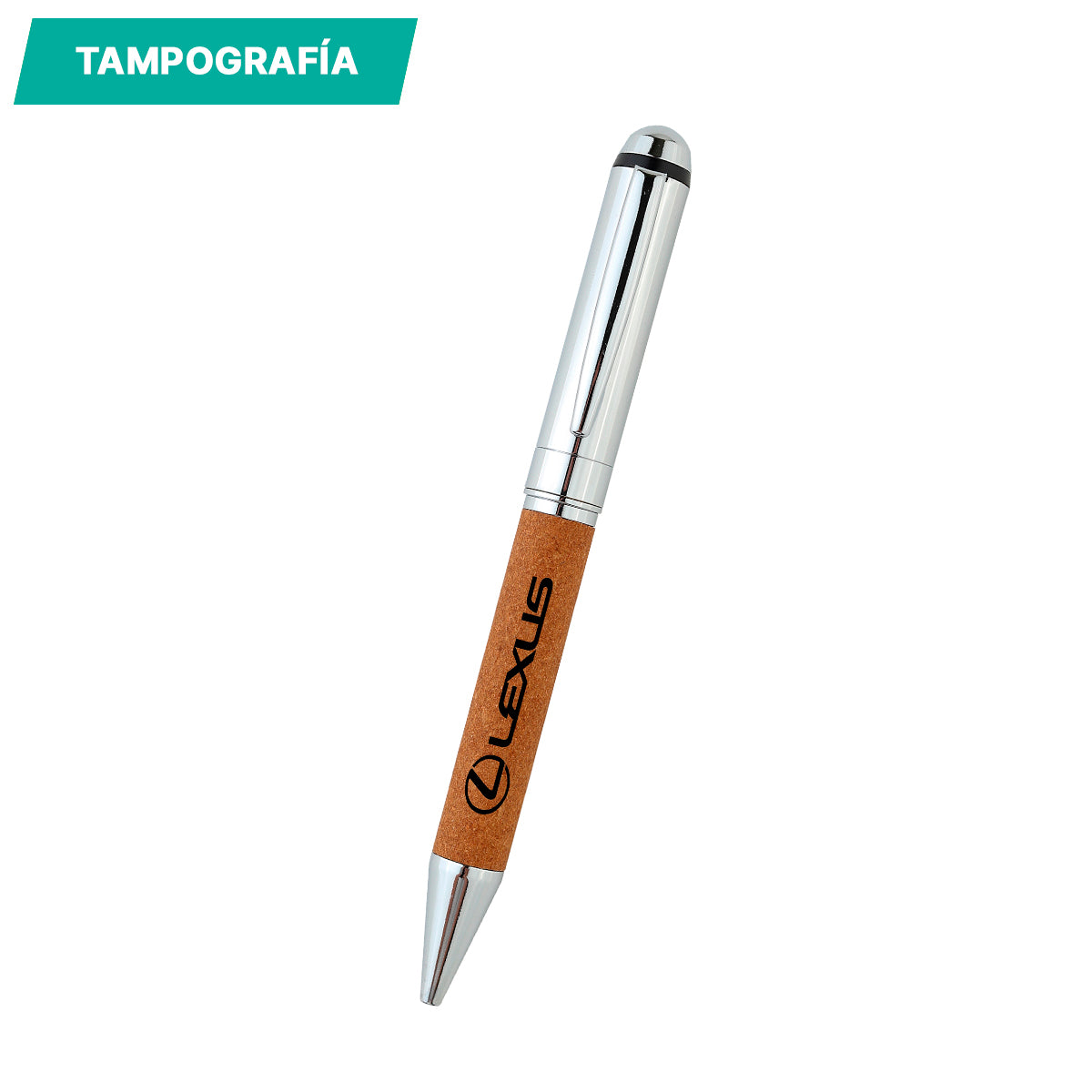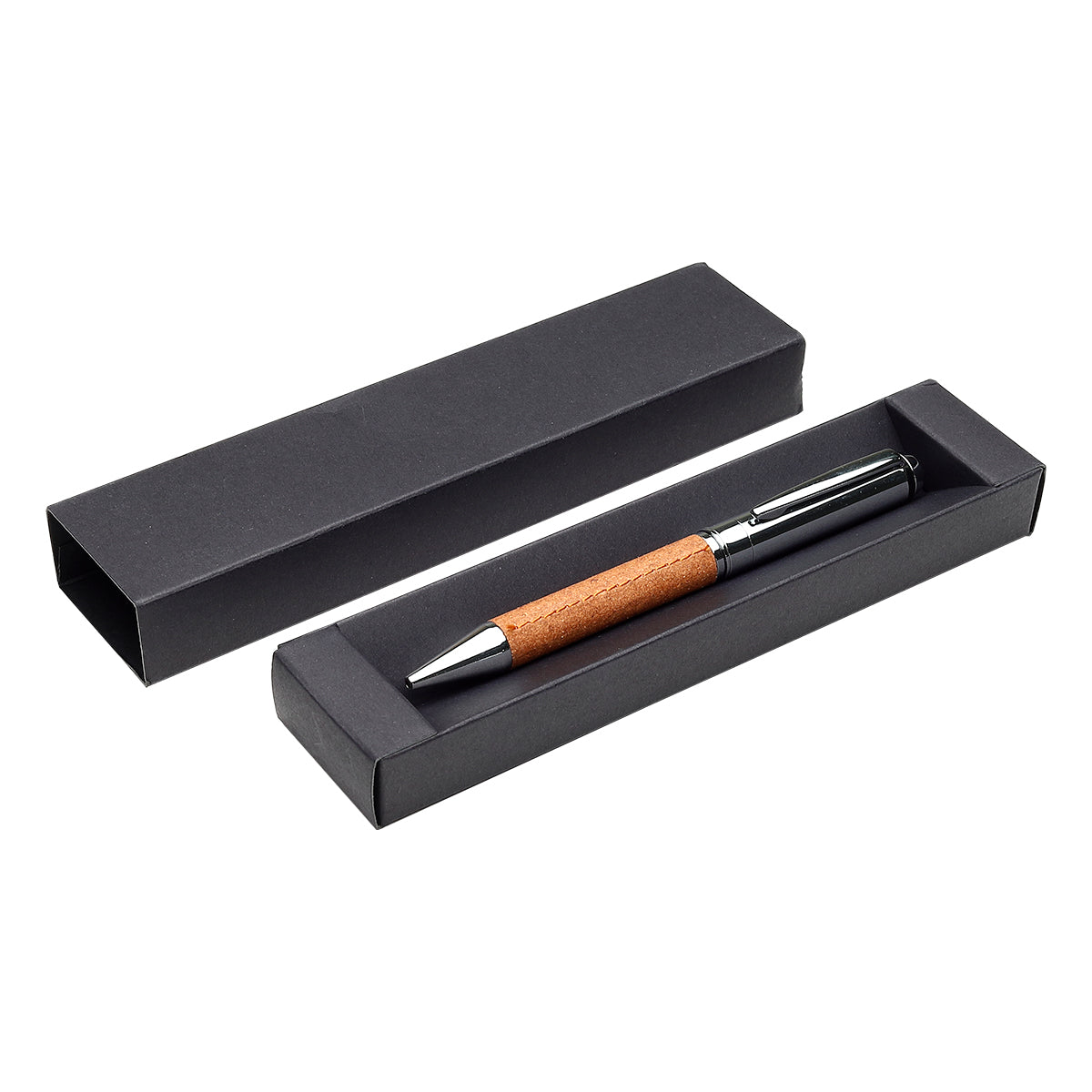 bolígrafo con barril de metal y detalle en piel reciclada; con clip y punta de metal, tinta de escritura negra. incluye caja individual negra de cartón.