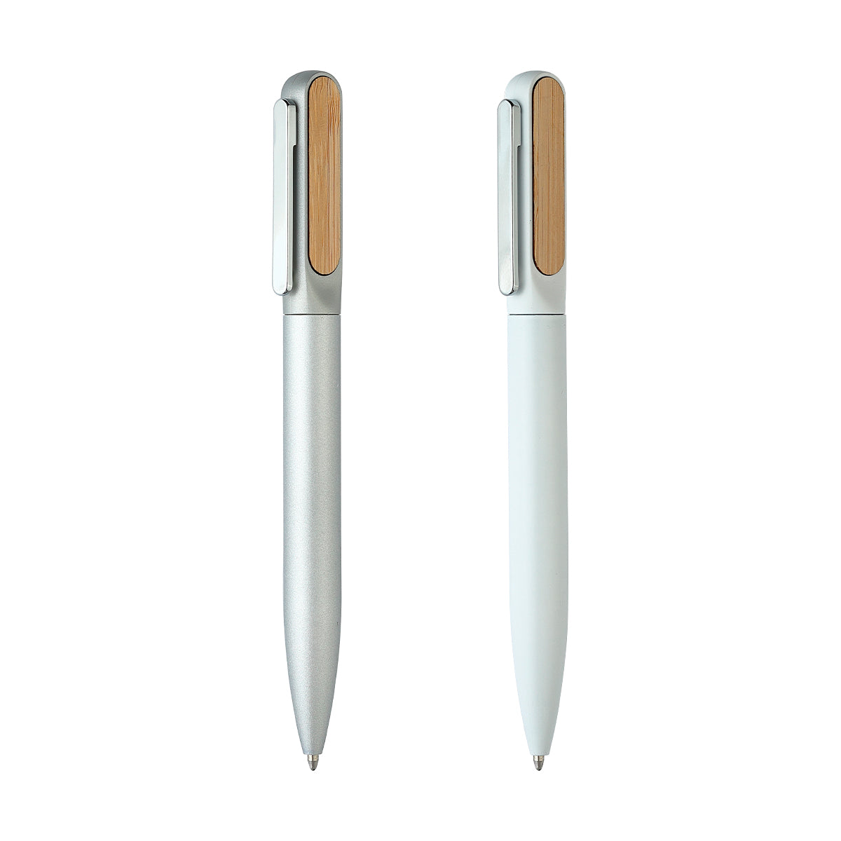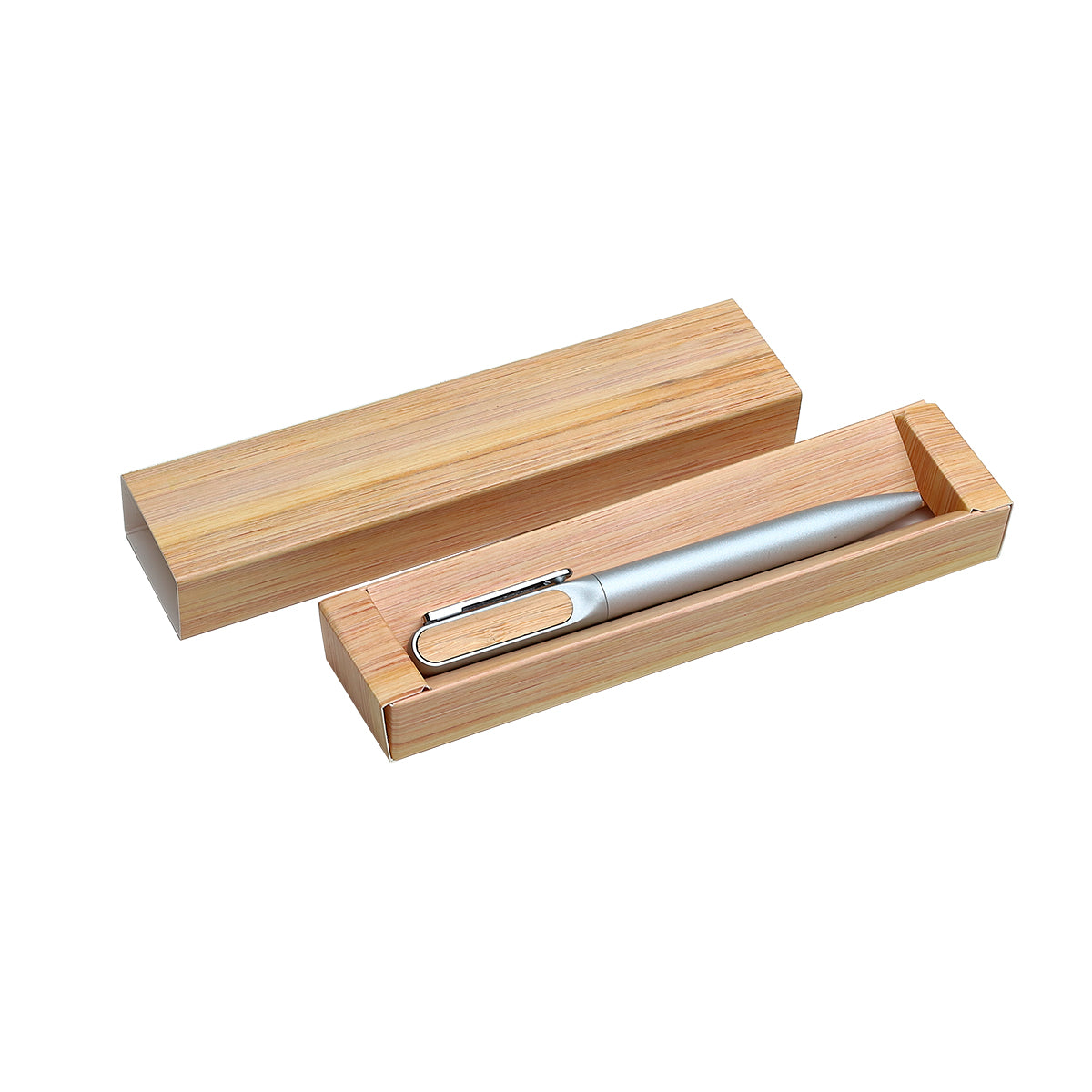 bolígrafo con barril de aluminio acabado mate y detalle superior en bambú. tinta de escritura negra. incluye caja de cartón individual con apariencia bambú.