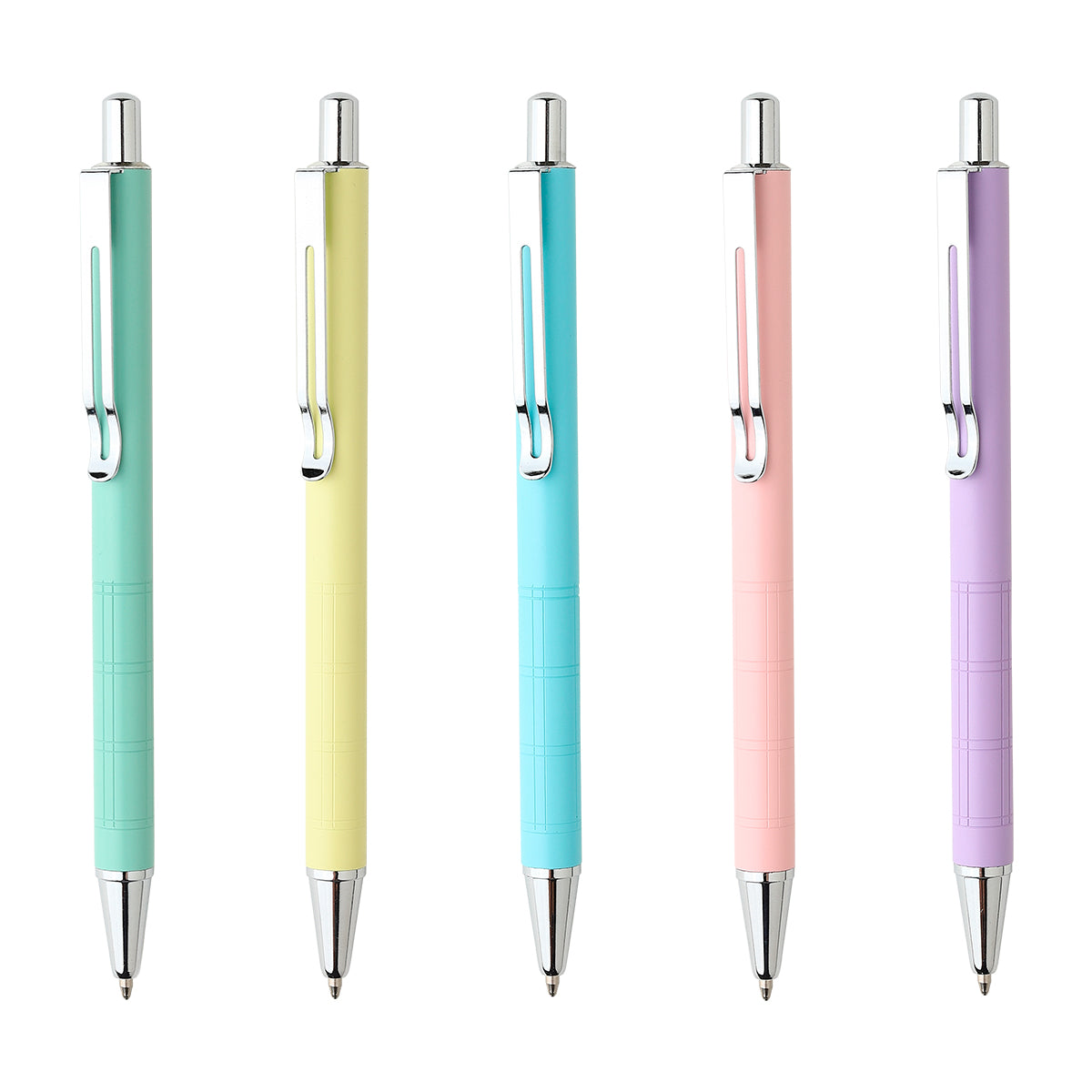 bolígrafo con barril de aluminio en acabado de tonos pastel, con clip y punta cromados. tinta de escritura negra.