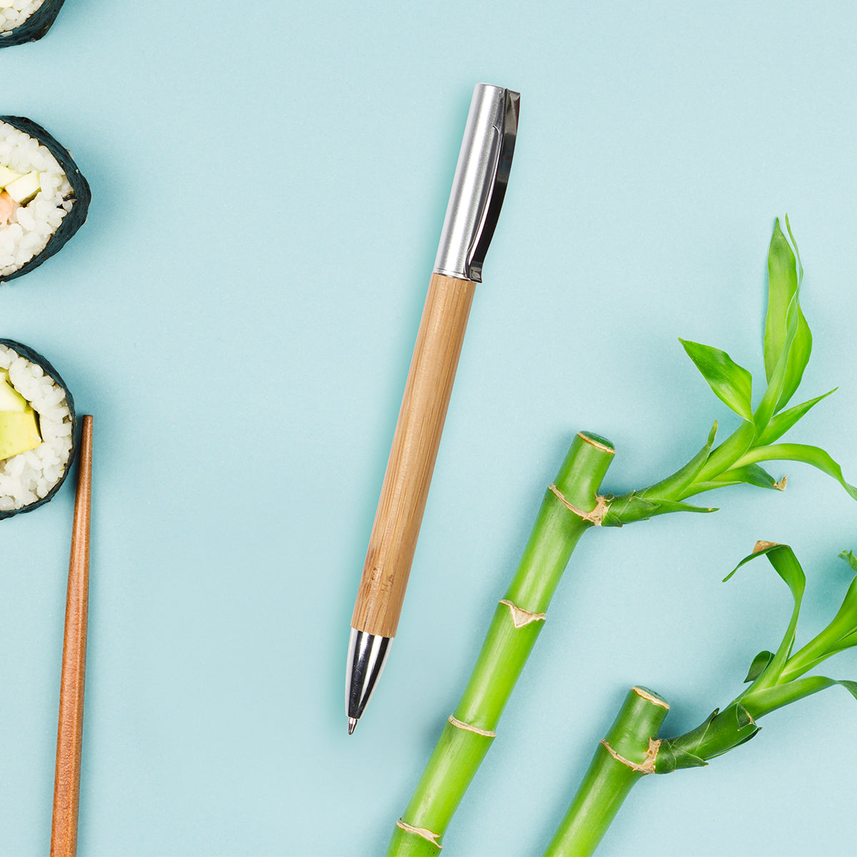 bolígrafo twist con barril de bambú, despliega y retrae la punta del bolígrafo con un simple giro. el bambú es un material sostenible y renovable que le da un aspecto cálido y atractivo. el clip y la punta del bolígrafo están hechos de metal. tinta de escritura negra.