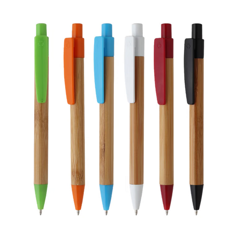 bolígrafo retráctil fabricado en bambú con punta y clip de plástico en color, tinta de escritura negra.
