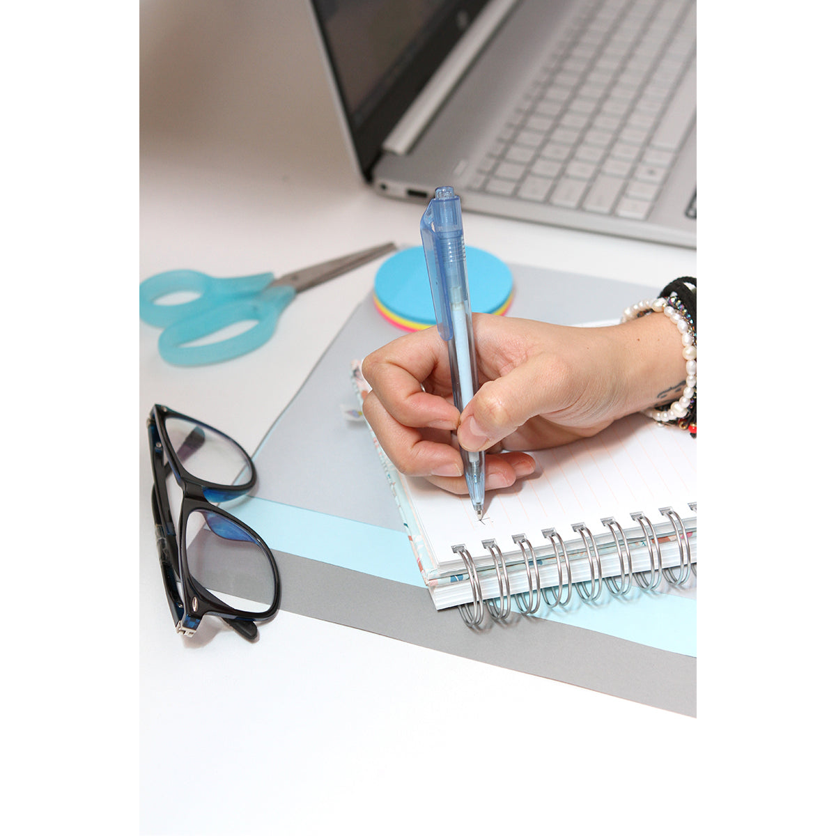 bolígrafo translúcido retráctil fabricado en pet reciclado (rpet), con tinta de escritura negra. el pet es el tipo de plástico más común usado principalmente para la fabricación de botellas desechables. una gran parte de los desechos en el planeta se atribuyen a este material; el pet reciclado o rpet es el plastico más reciclado en el mundo; lo cual da vida a un nuevo material cuyos resultados reducen el impacto al medio ambiente.