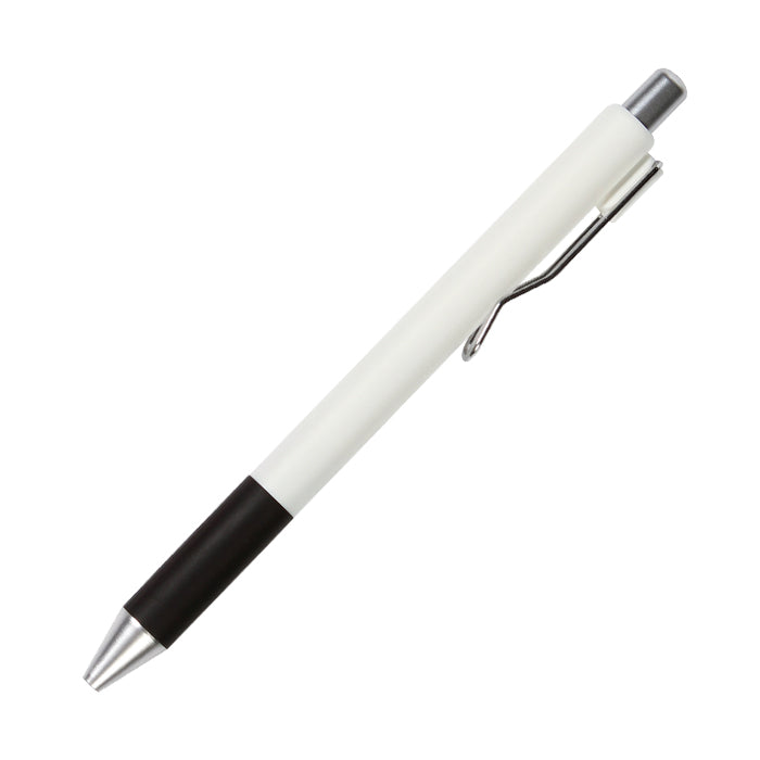 bolígrafo retráctil fabricado en plástico con clip cromado, punta con acabado metalizado y gris de color. tinta de escritura de gel negra.