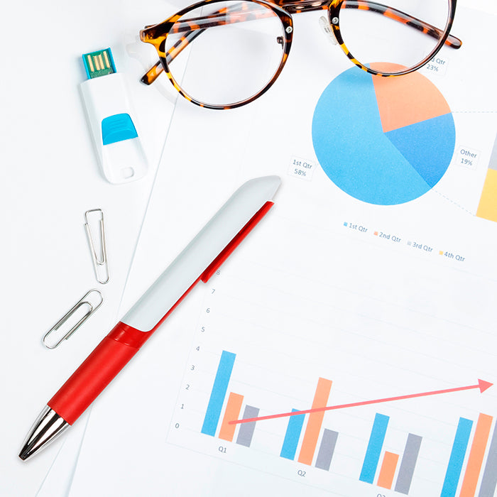 bolígrafo twist tipo ball pen, fabricado en plástico, con agarre de goma en el cuerpo del bolígrafo. utiliza tinta de escritura azul.