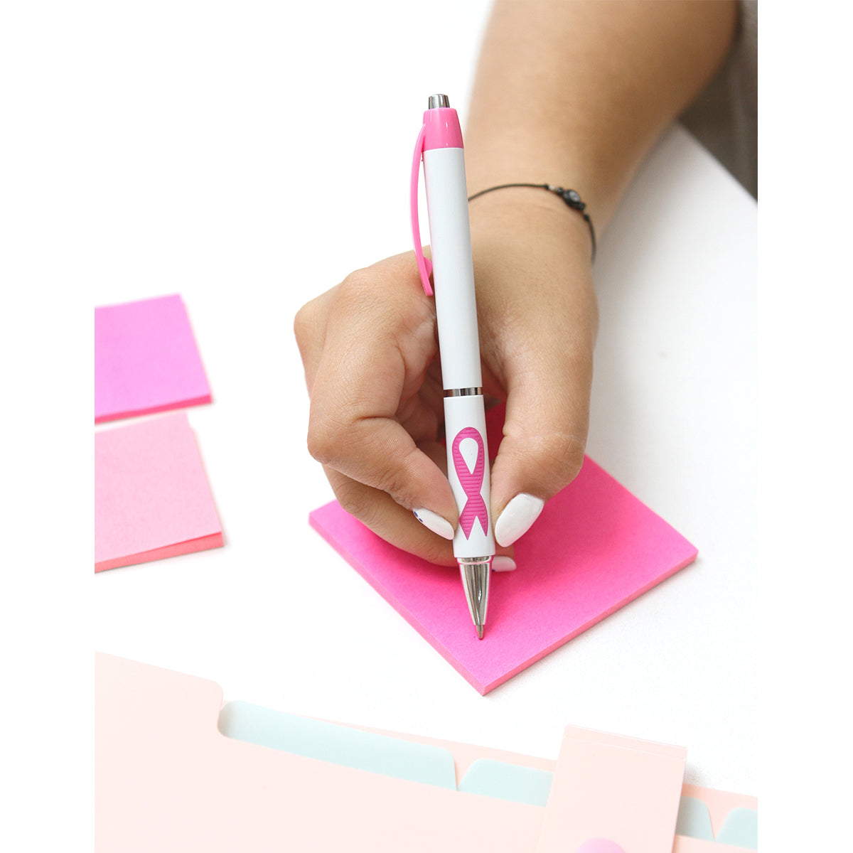 bolígrafo retráctil fabricado en plástico abs, clip y detalle en barril color rosa, tinta de escritura negra.