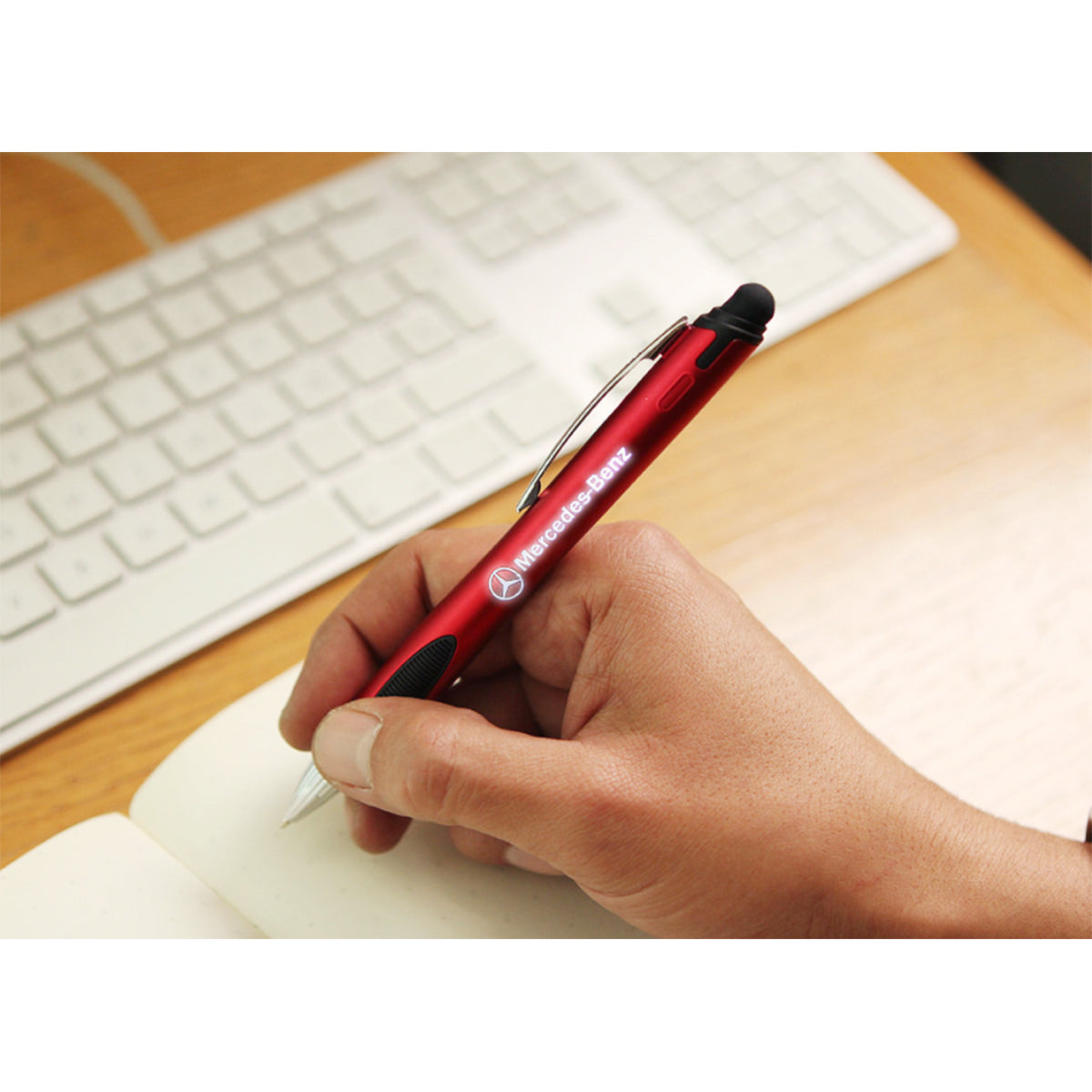 bolígrafo fabricado en plástico con apariencia metalica, incluye luz led en el interior la cual ayuda a resaltar algún logotipo que quieras grabar, con detalles cromados en diversas partes, incluye un puntero touch y un grip de color negro. utiliza tinta de escritura negra.