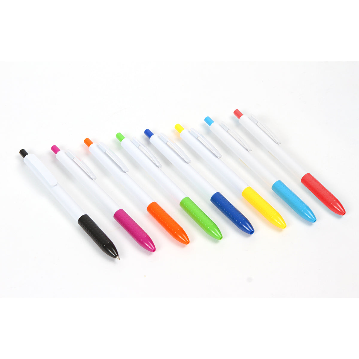 bolígrafo con barril fabricado en plástico abs color blanco, con punta y botón en diferentes colores a elegir, mecanismo de botón. tinta de escritura color negro.