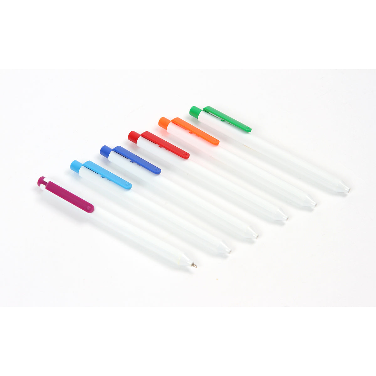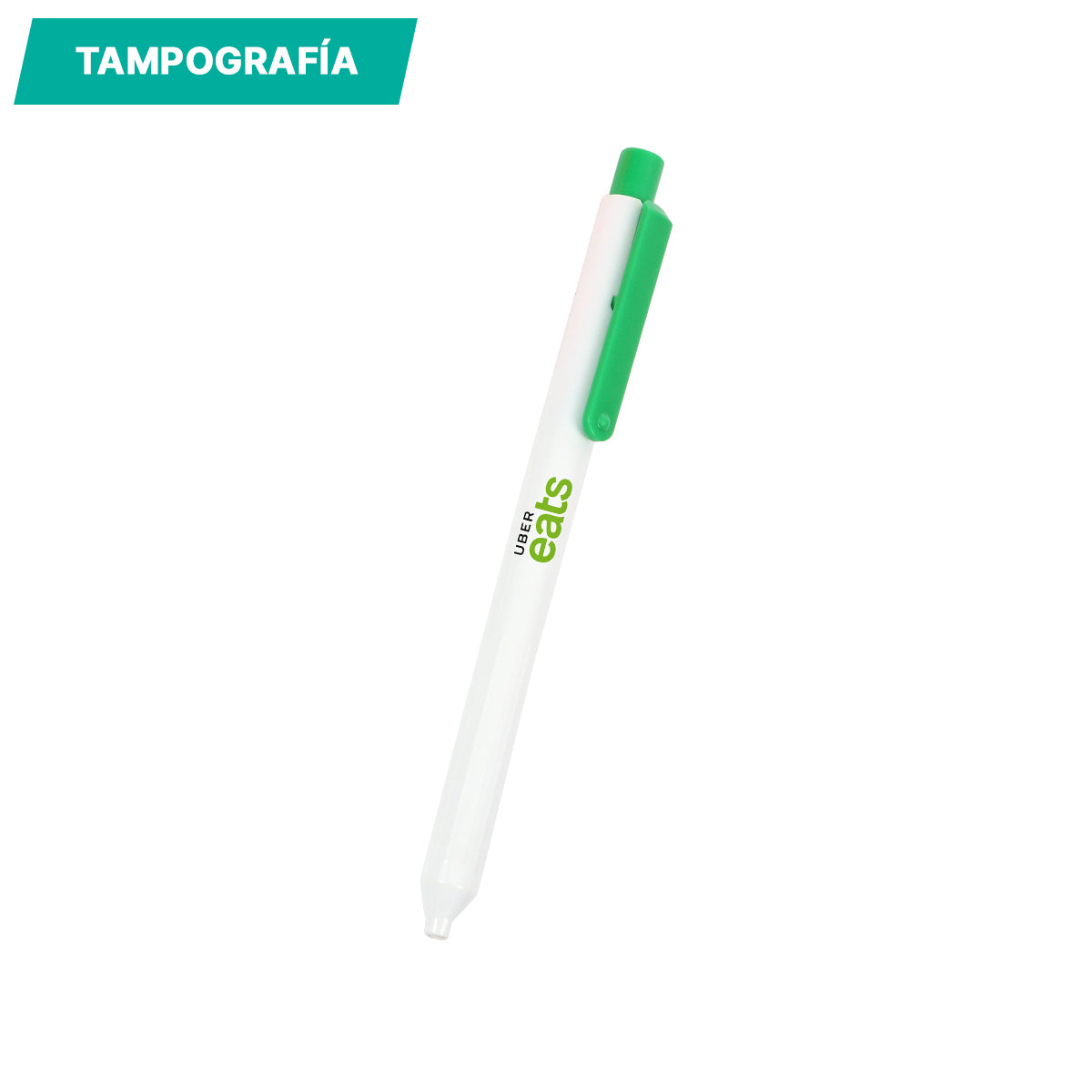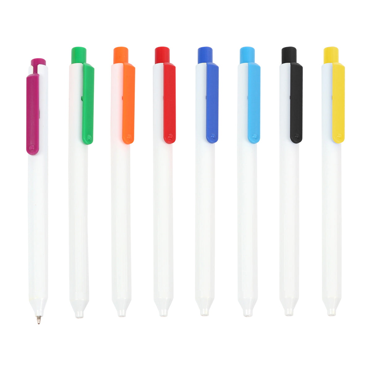 bolígrafo con barril fabricado en plástico abs color blanco y clip en diferentes colores a elegir, mecanismo de botón. tinta de escritura negra.