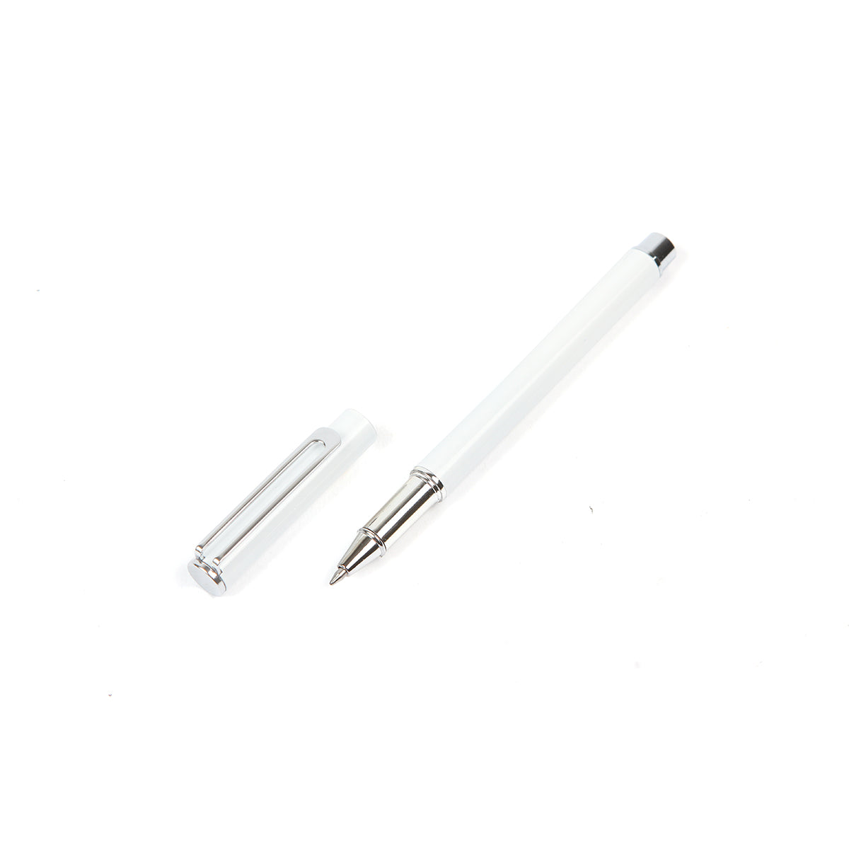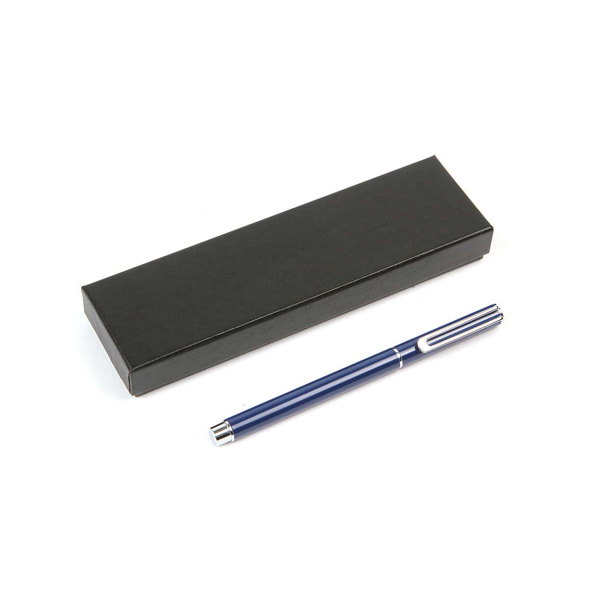 bolígrafo con barril fabricado en acero inoxidable, con detalles en color plateado, tipo roller pen, tinta de escritura de gel color negro. incluye caja de regalo color negro.