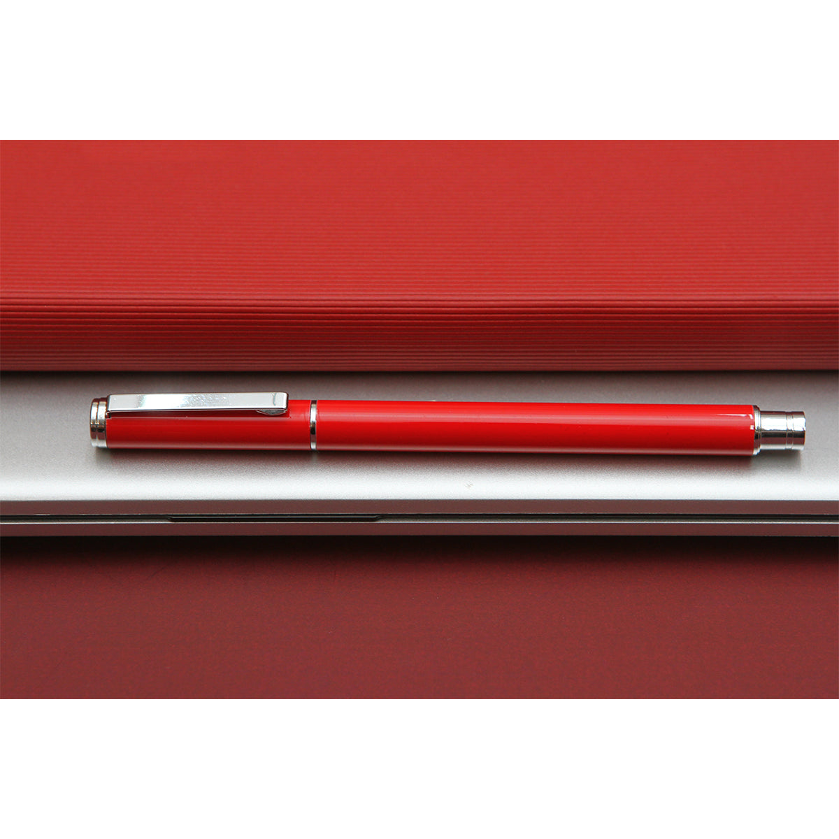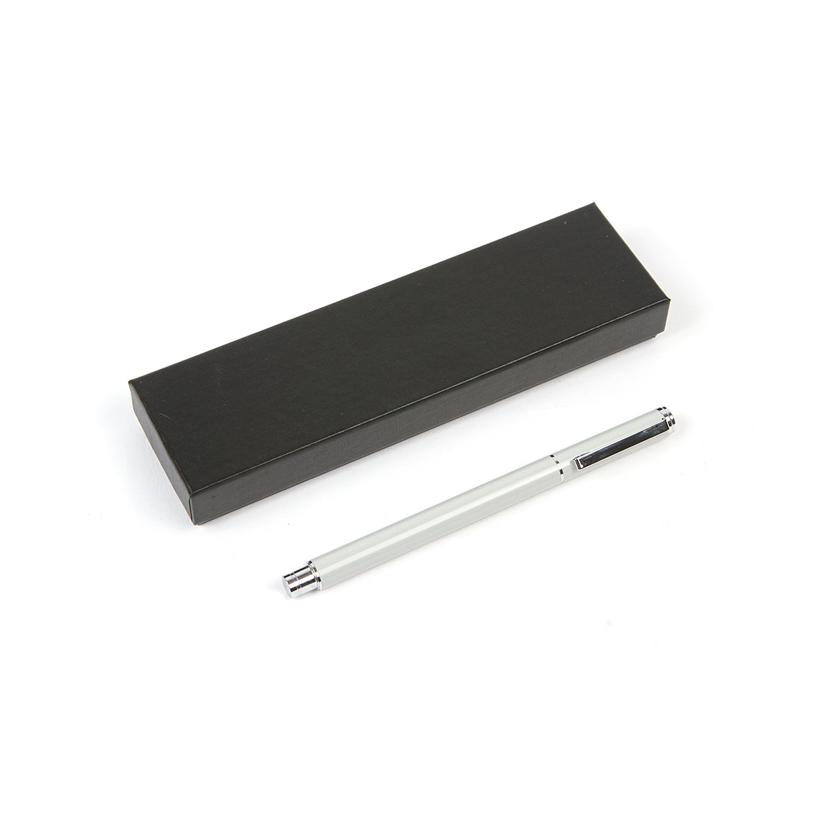 bolígrafo con barril fabricado en acero inoxidable, con detalles en color plateado, tipo roller pen, tinta de escritura negra. incluye caja de regalo color negro.