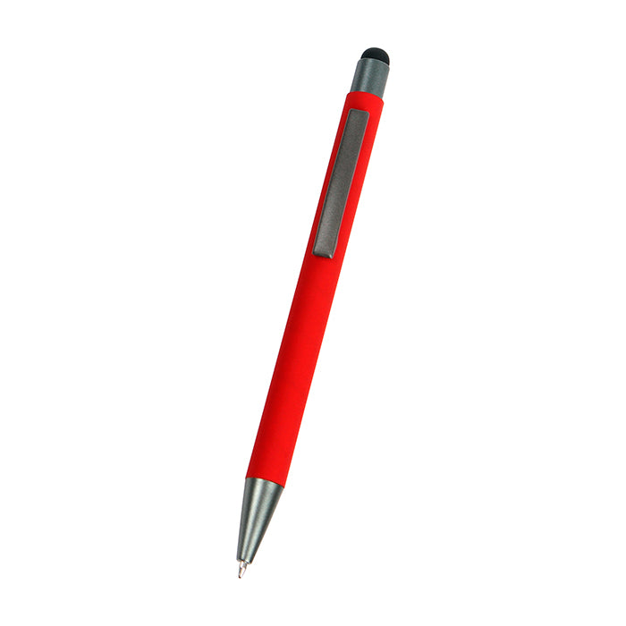 bolígrafo fabricado en aluminio con cubierta rubber, un material ligero y duradero que le confiere una apariencia moderna y resistente a largo plazo. cuenta con una función touch, en la parte superior del bolígrafo como un puntero para dispositivos electrónicos de pantalla táctil. utiliza tinta de escritura negra.
