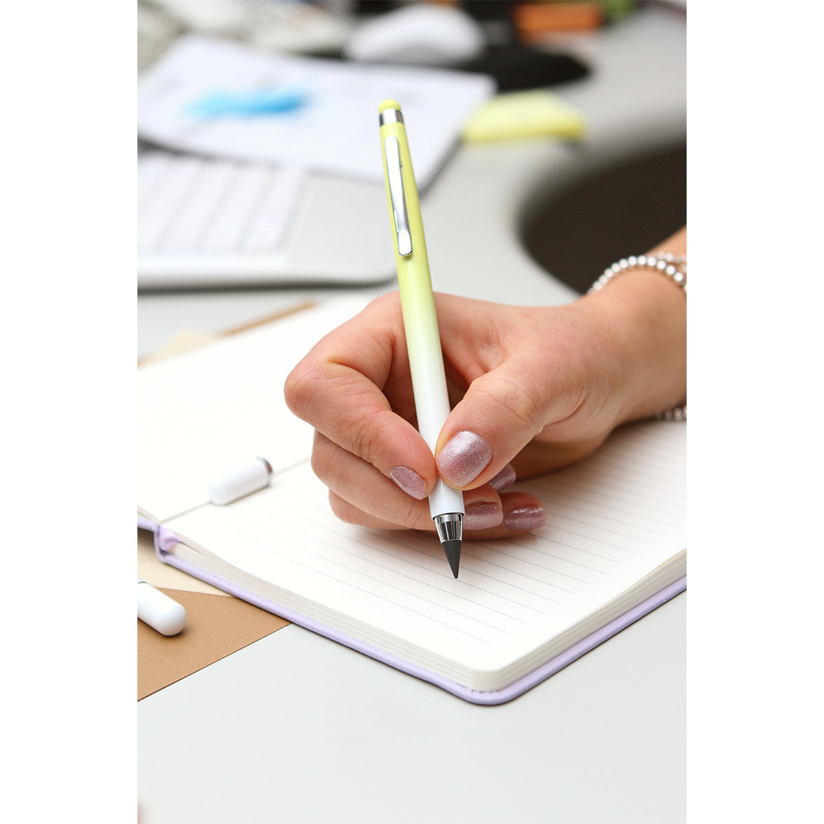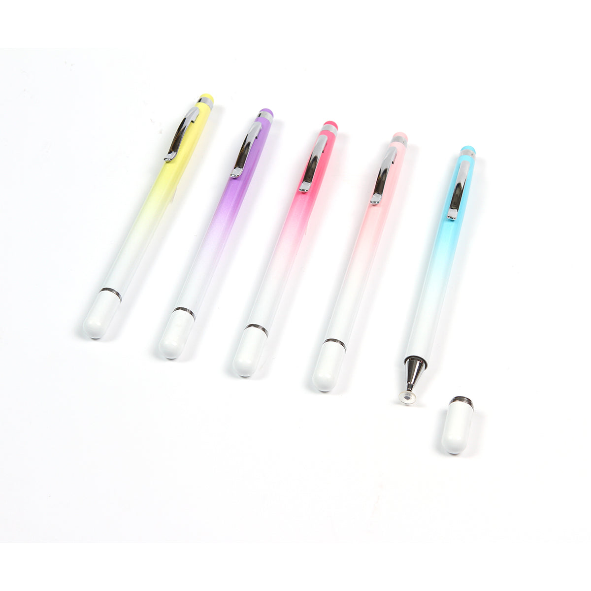 lápiz tipo bolígrafo dos en uno, con touch en la parte superior para pantallas de dispositivos electrónicos. barril fabricado en aluminio con clip de metal. incluye tapa magnética. disponible en diferentes colores degradados.