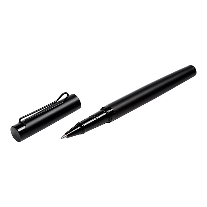 bolígrafo fabricado en acero inoxidable con acabado mate, con tapa y clip, incluye detalles con acabados brillosos. tinta de escritura negra alemana, rinde hasta 800 mts. incluye estuche para mayor protección al momento de transportar.