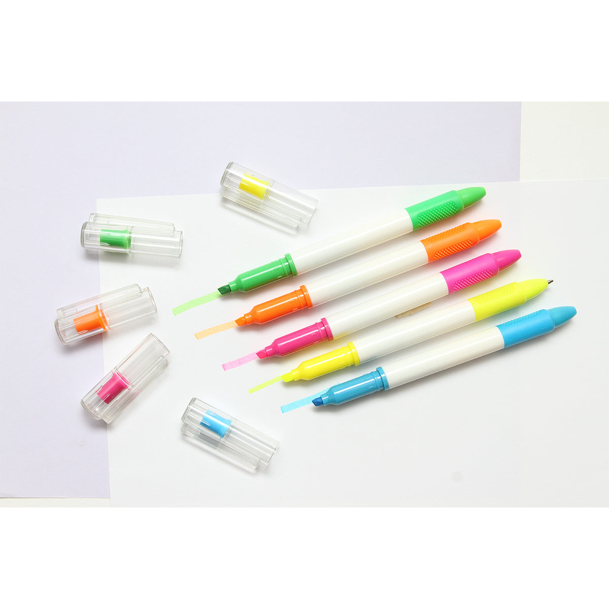 bolígrafo 2 en 1 con acción giratoria y marca textos con tapa traslúcida. barril hecho de plástico reciclado abs con detalle en goma con textura para mejor uso. tinta de escritura negra y el marca textos hace juego según el color exterior. combina funcionalidad y versatilidad en un solo producto.