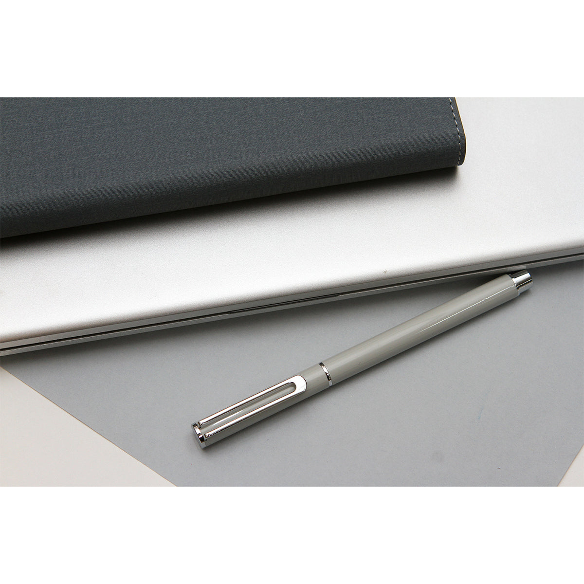 bolígrafo con barril fabricado en acero inoxidable, con detalles en color plateado, tipo roller pen, tinta de escritura de gel color negro. incluye caja de regalo color negro.