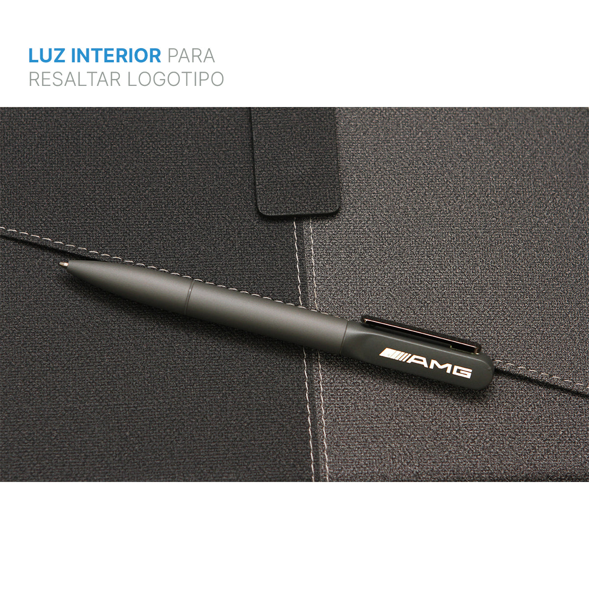 bolígrafo con efecto de luz led, fabricado en aluminio y plástico, con clip metálico. la luz se muestra al grabar logo con láser (puede usarse en ambos lados). cuenta con mecanismo de giro y tinta de escritura negra.