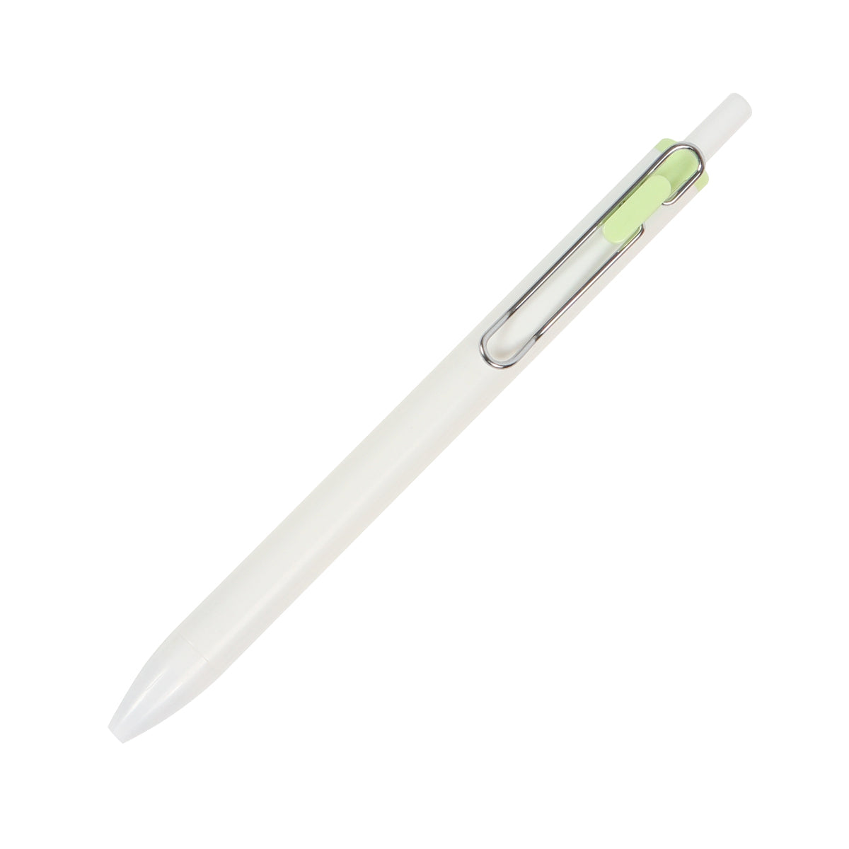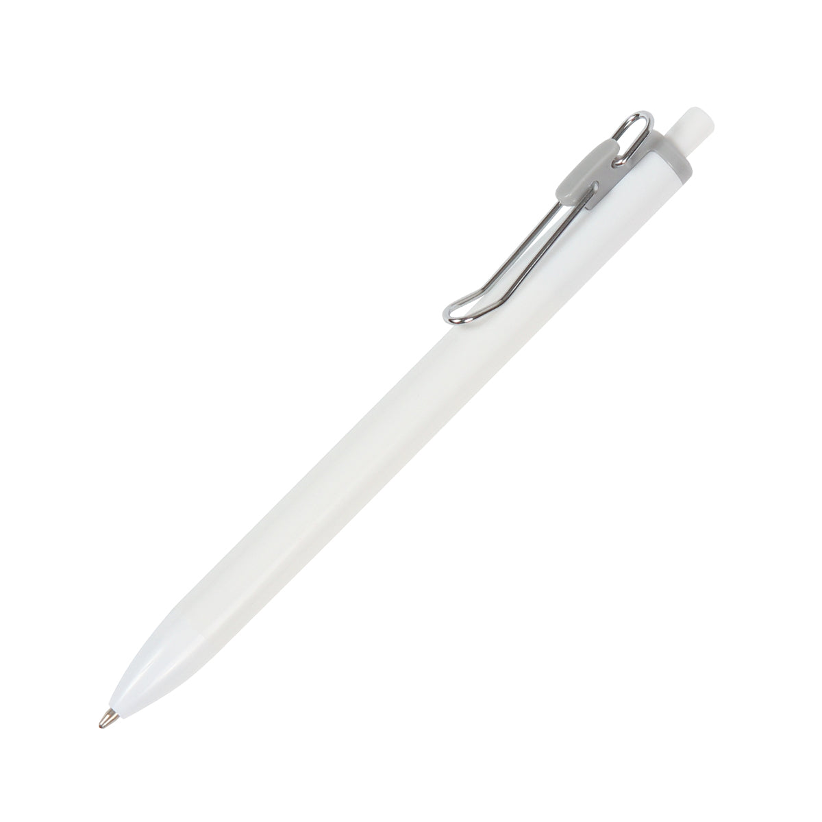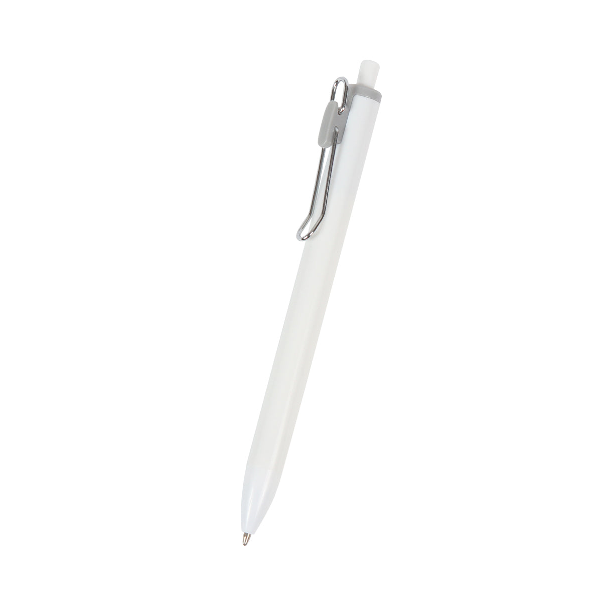 bolígrafo de acción de empuje, barril de color blanco sólido con detalles en colores pastel y clip color cromo plateado. refill delgado x-20. tinta de escritura azul.