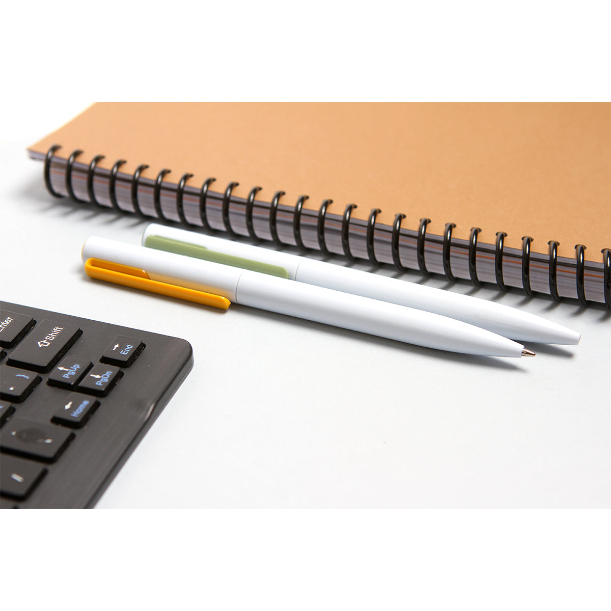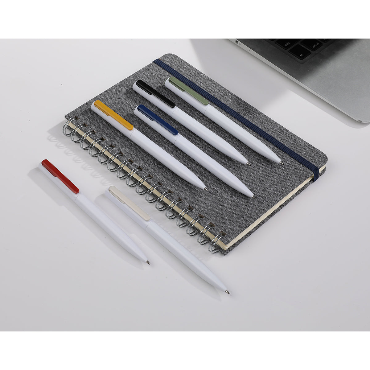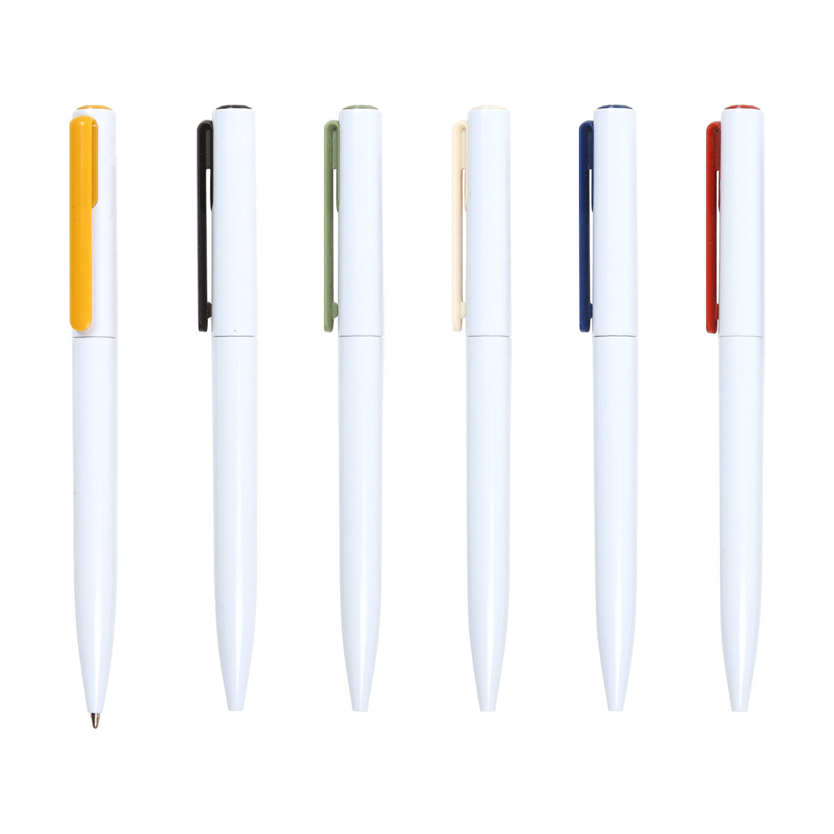 bolígrafo de acción giratoria, cuerpo blanco sólido, clip de color sólido, recarga delgada x-20. barril fabricado en abs. tinta de escritura negra.
