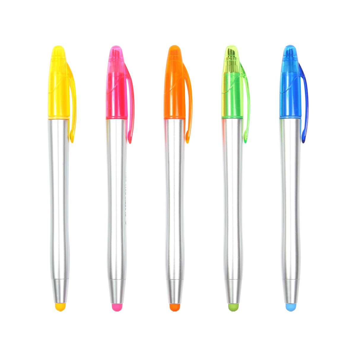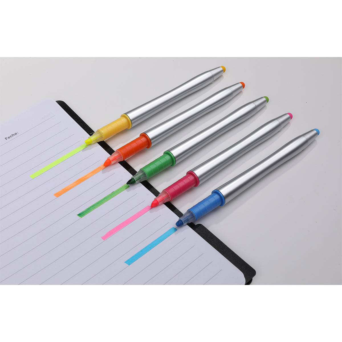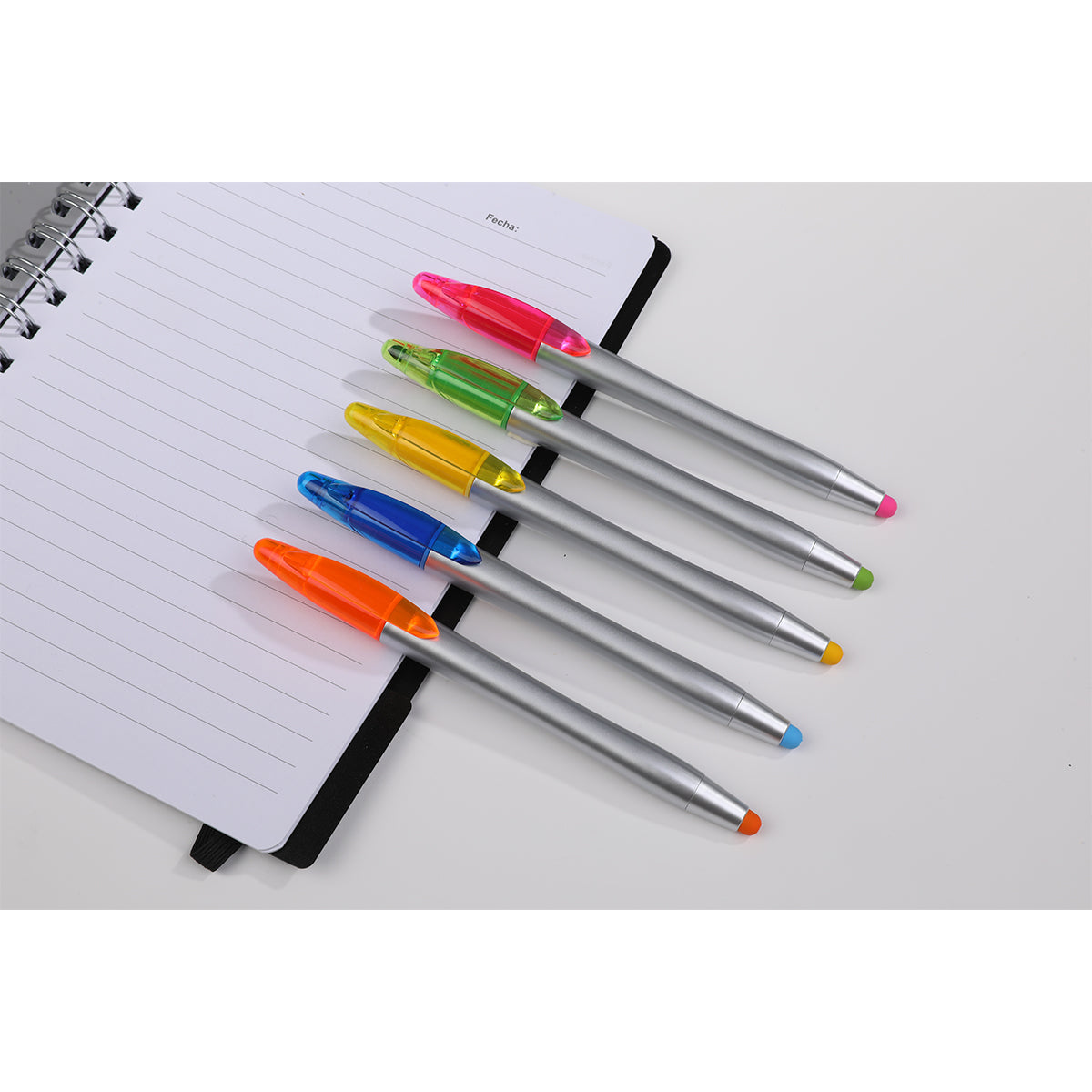 bolígrafo de doble punta, tapa de color translúcido, cuerpo de plástico esterilizado en tono plateado, punta rociada metálica, lápiz óptico resaltador de color en la parte superior, bolígrafo en el otro, recambio delgado x-20. material: barril de abs, tapa de pp. tinta de escritura azul.