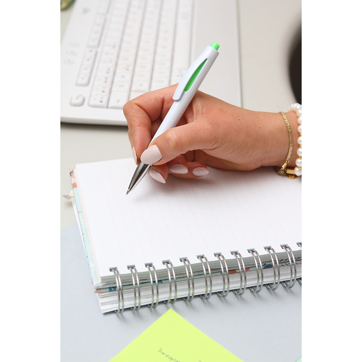bolígrafo fabricado en plástico abs, con función retráctil, cuenta con detalles de color, punta metálica y tinta de escritura negra.