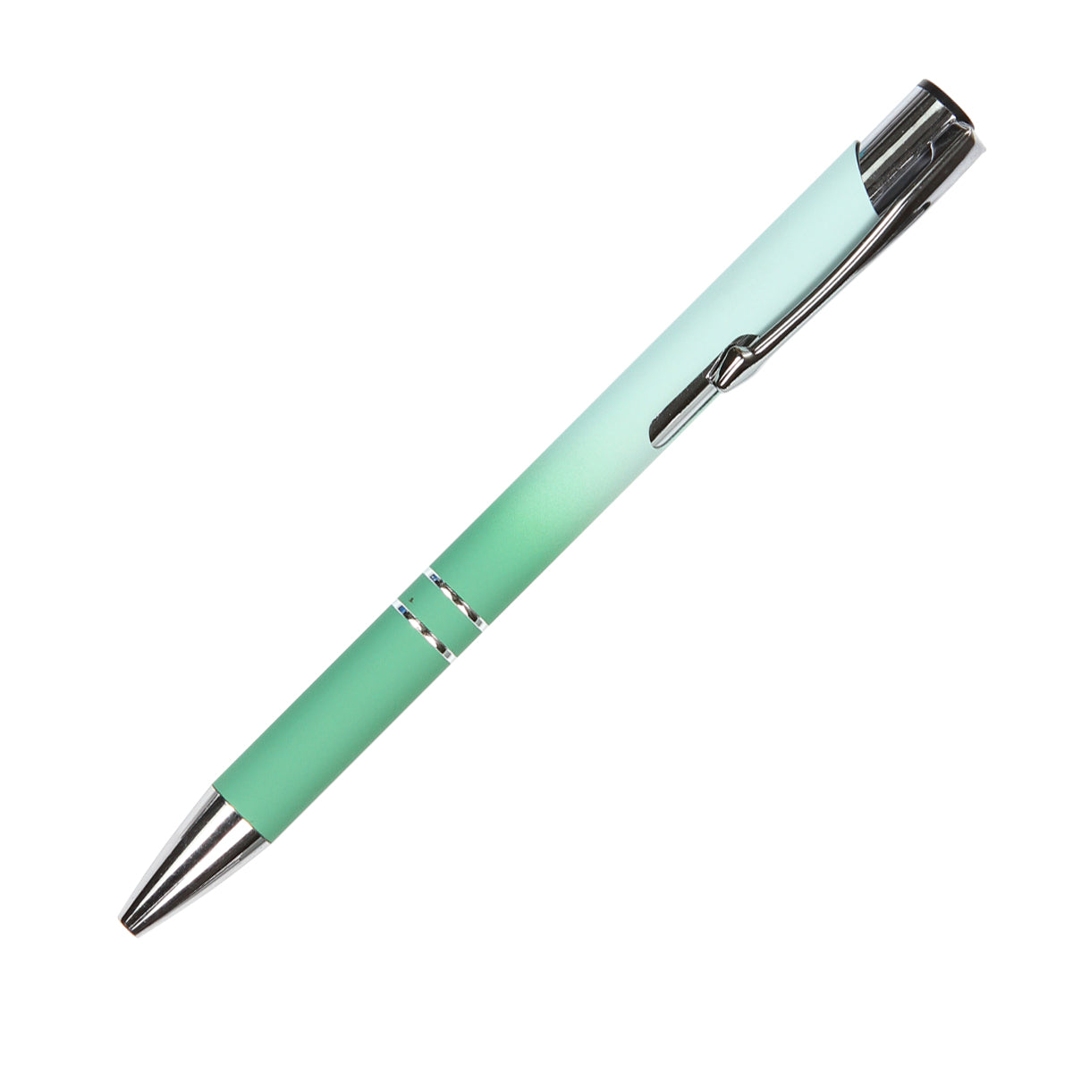 bolígrafo con barril de aluminio de color degradado con acabado de goma, 2 anillos en el barril, clip de metal cromado, botón y punta cromados, recambio parker de plástico y tinta de escritura negra.