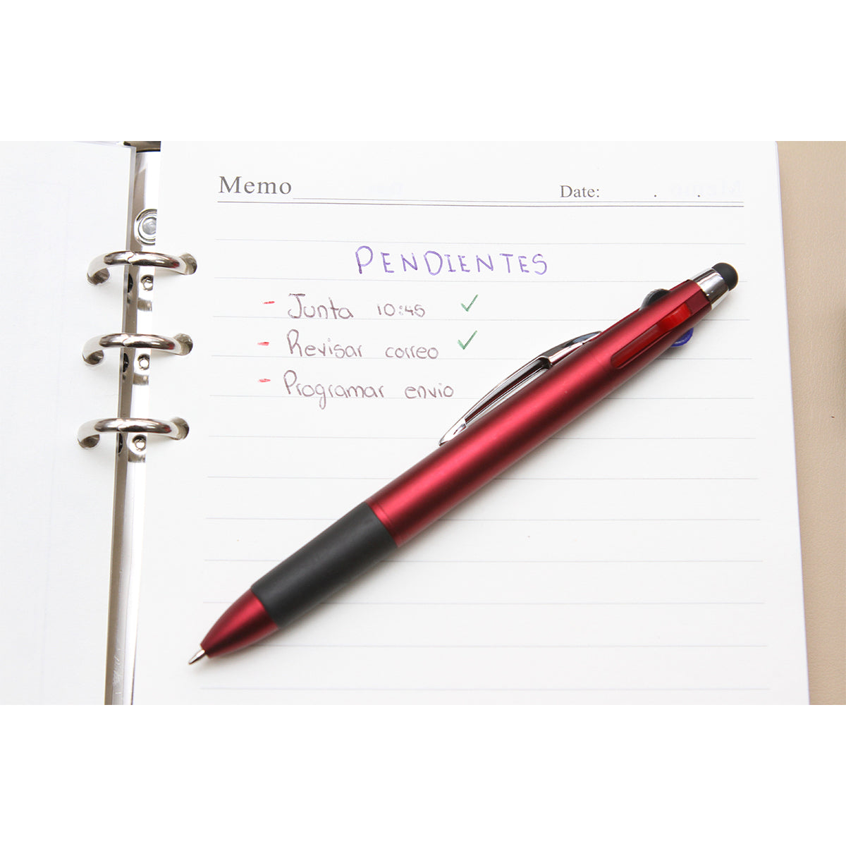 bolígrafo 3 en 1, con barril de plástico abs con terminado metalico, clip de plástico y touch en la parte superior. en la parte inferior trae una goma de silicona para mayor comodidad al momento de sujetarla, cuenta con 3 colores de escritura (azul, negro y rojo).el bolígrafo 3 en 1 es una herramienta versátil y práctica que combina la funcionalidad de cuatro bolígrafos en un solo dispositivo, proporcionando una solución conveniente para múltiples necesidades de escritura.