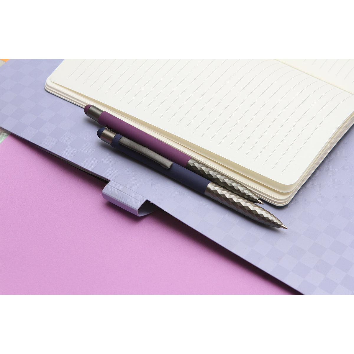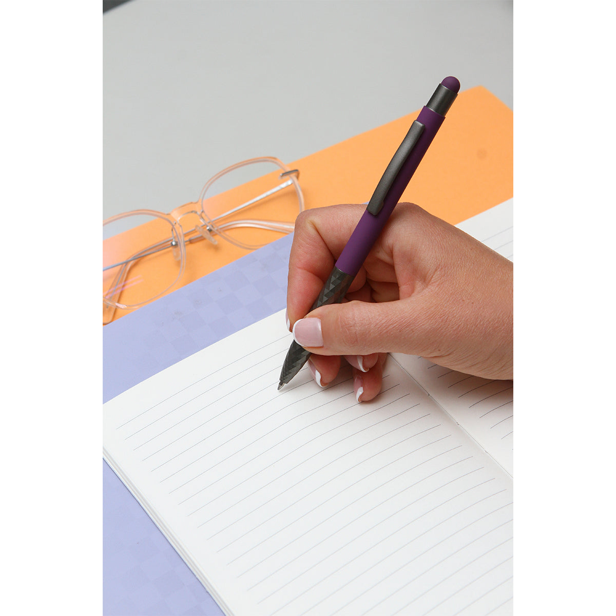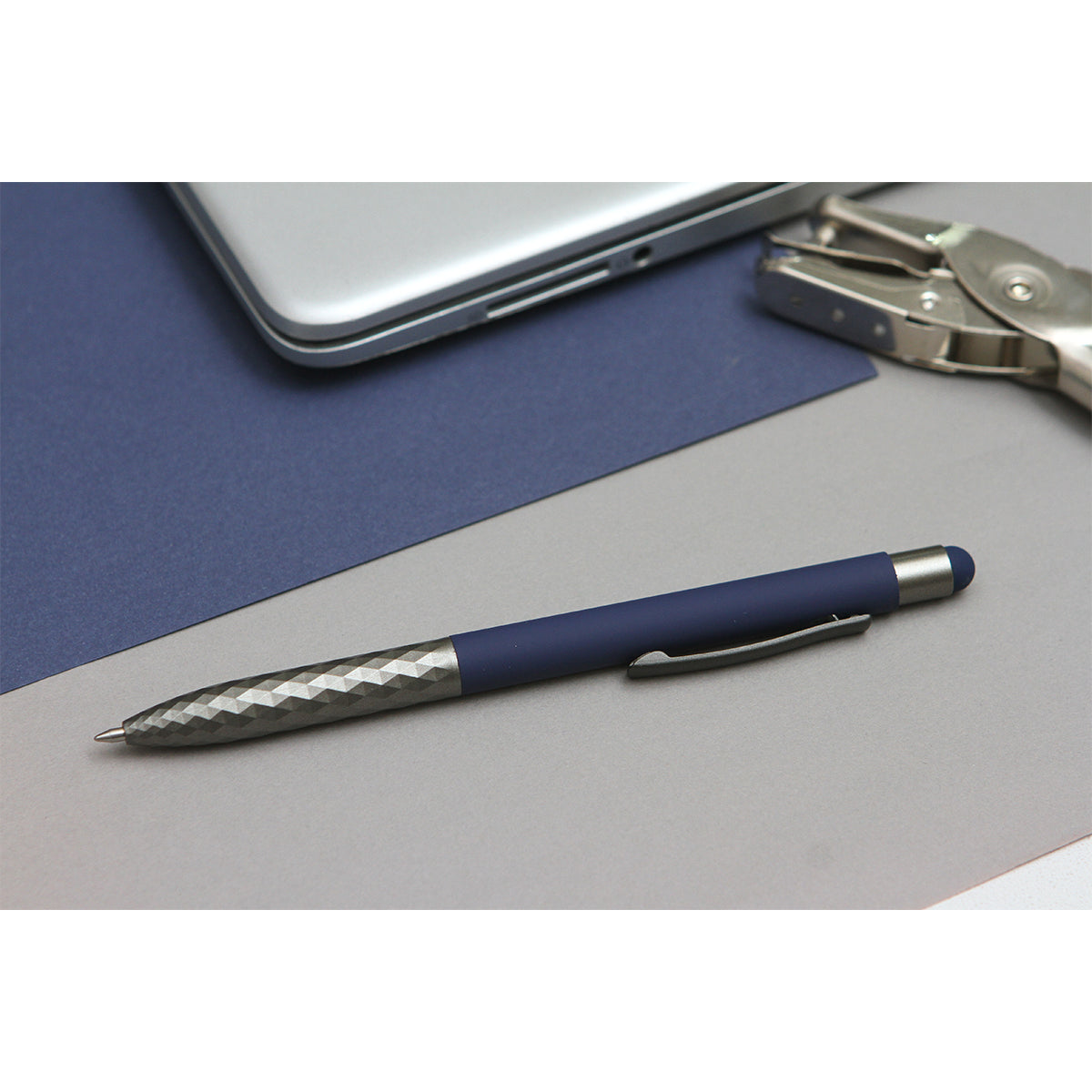 bolígrafo con barril de aluminio, clip y punta metálicos, con detalles en la punta del bolígrafo que le da un toque de estilo, con touch en la parte superior. tinta de escritura de gel azul.