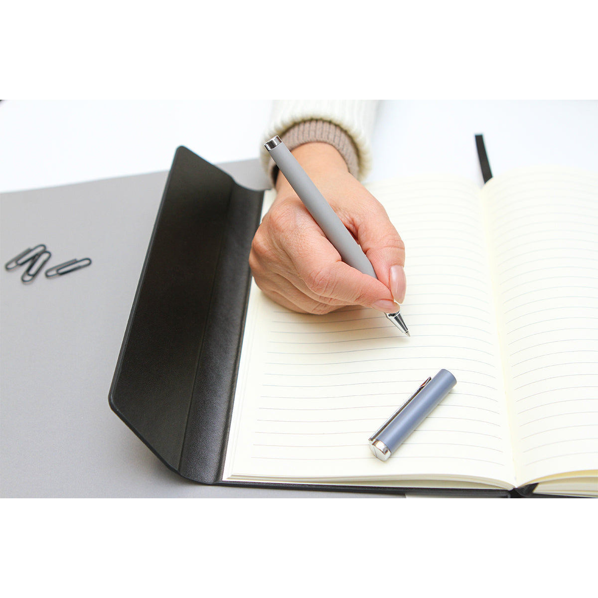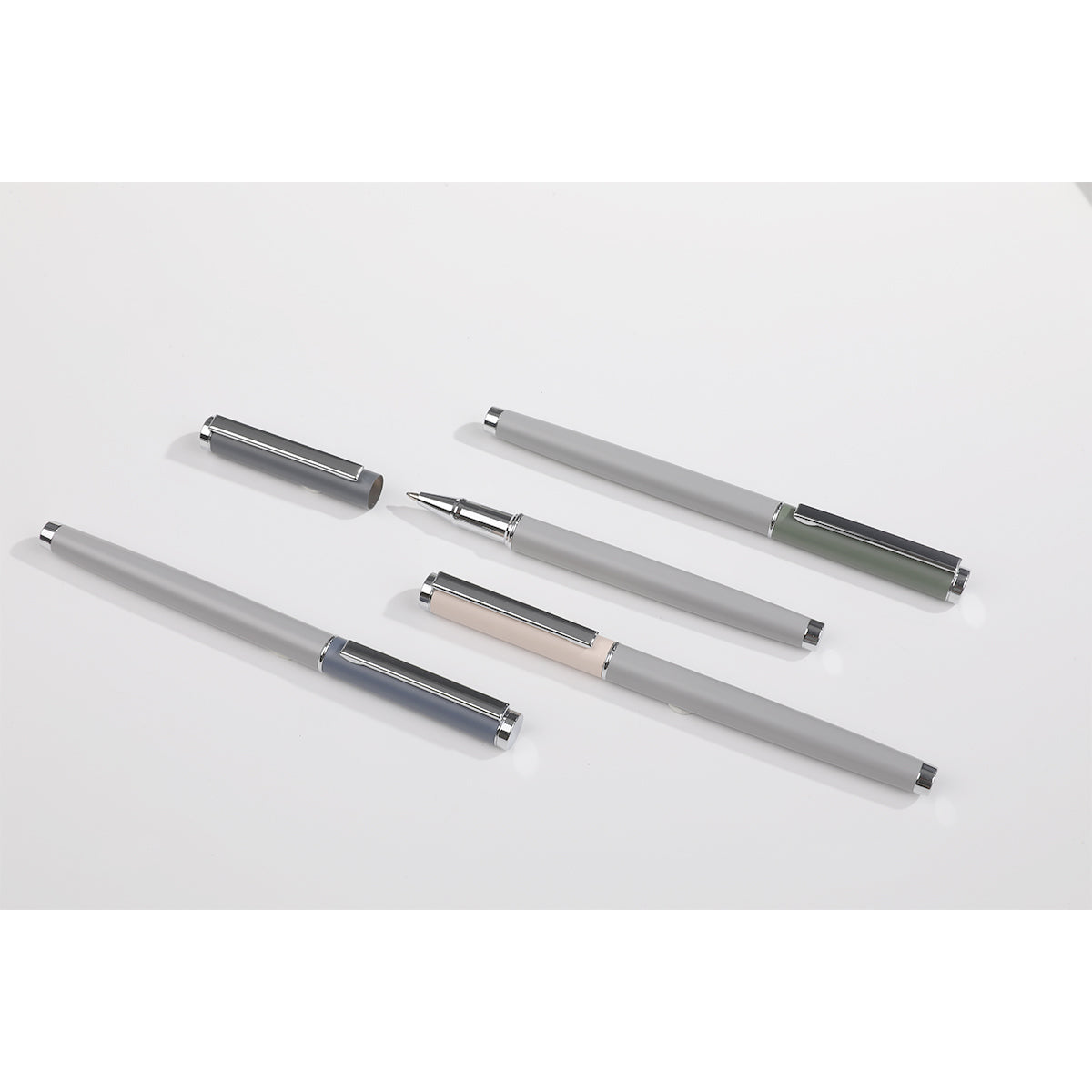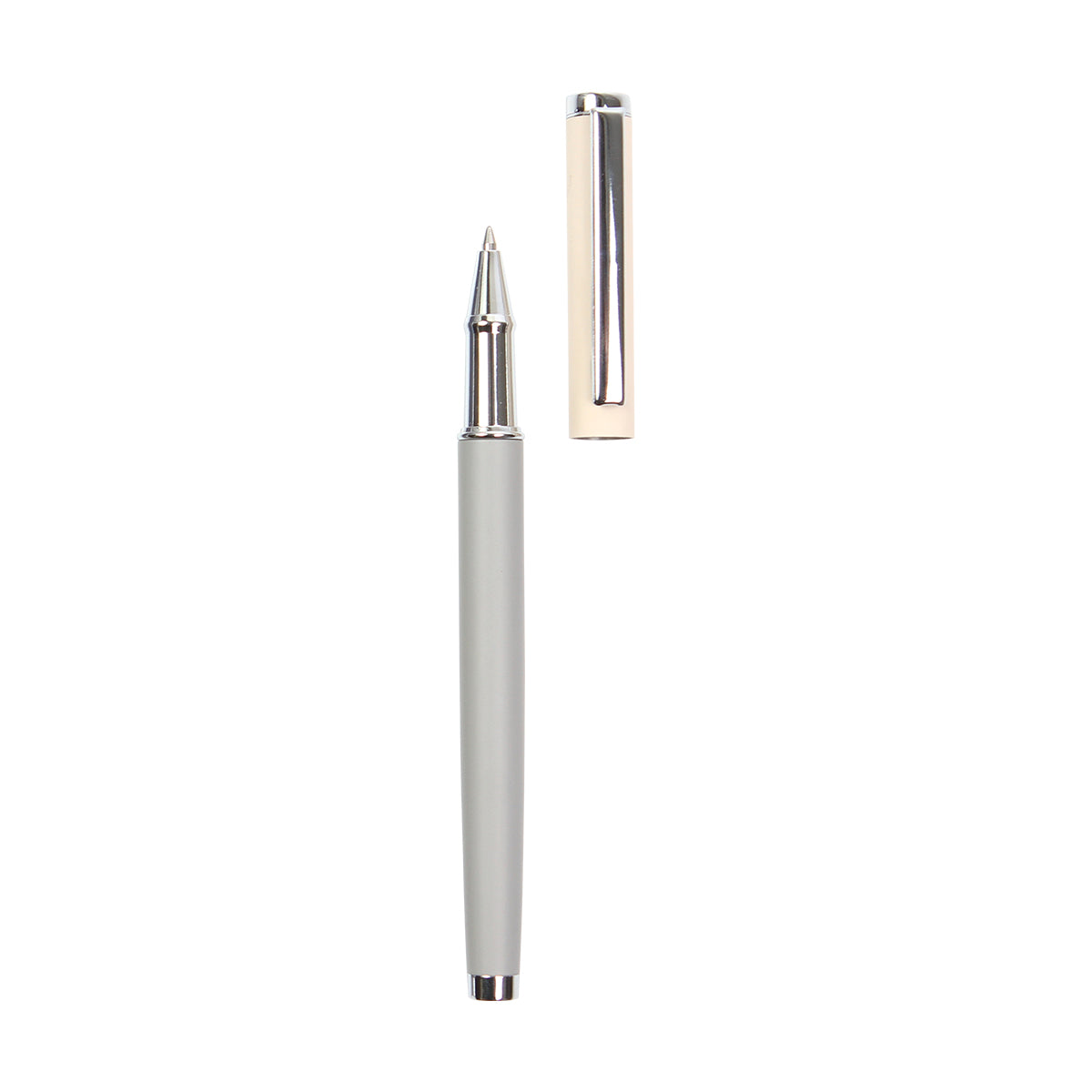 bolígrafo con mecanismo roll, cuerpo rociado metálico, adornos cromados y recarga de tinta enrollable. barril fabricado en acero inoxidable. tinta de escritura negra.
