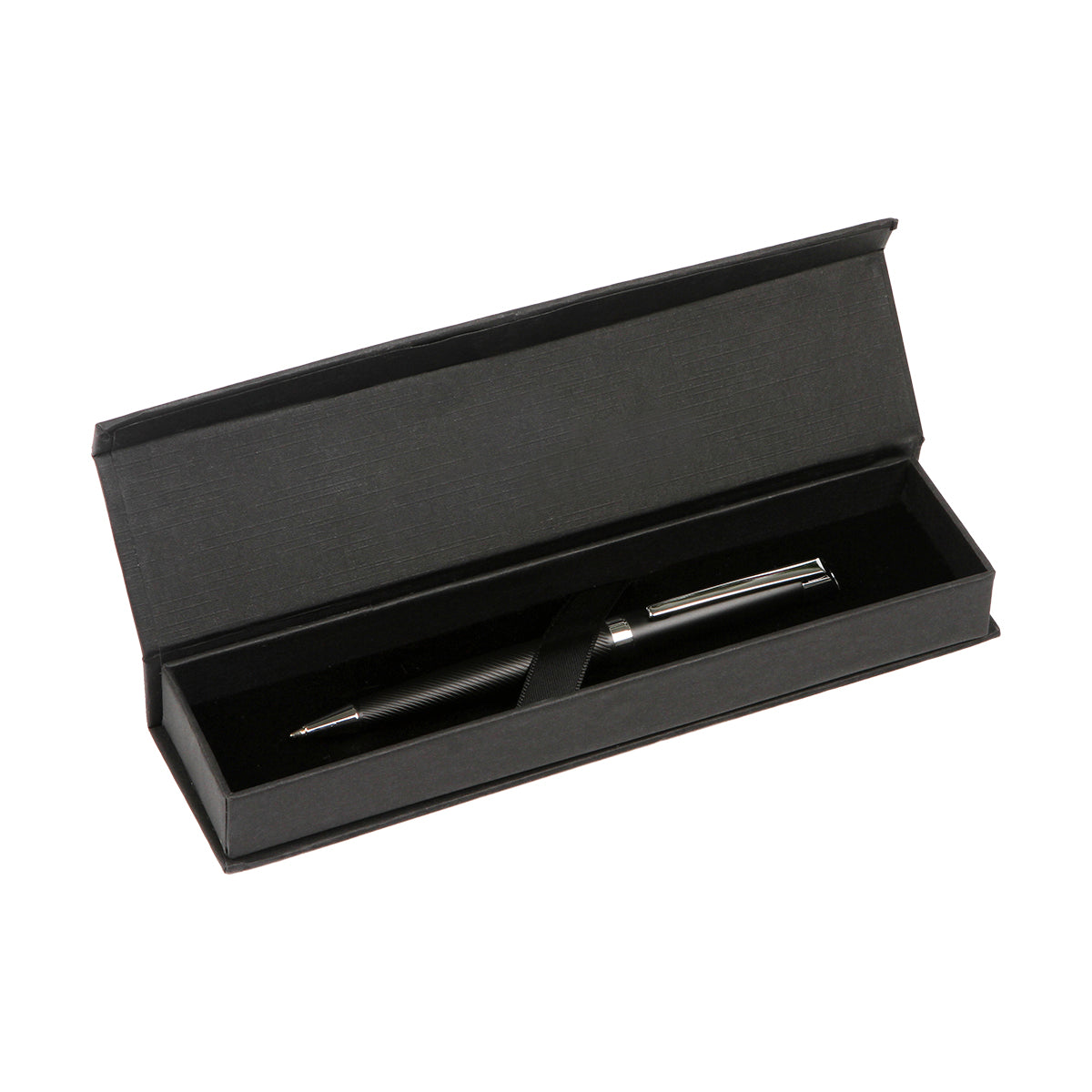 bolígrafo metálico con detalles cromados en punta y clip, tinta de escritura negra. incluye estuche individual.