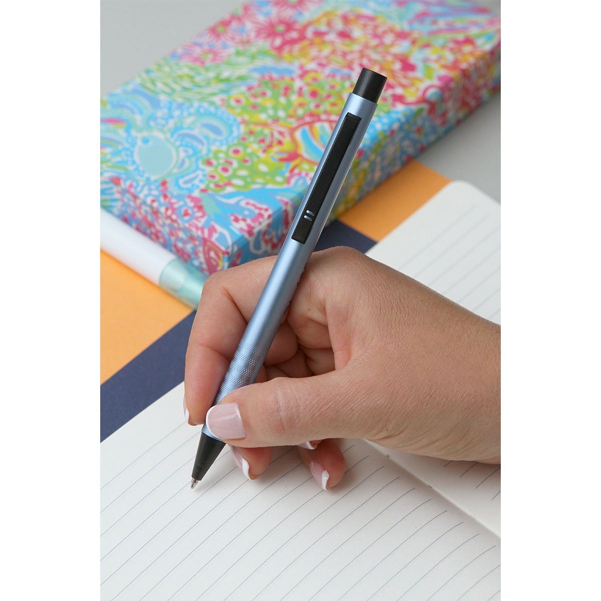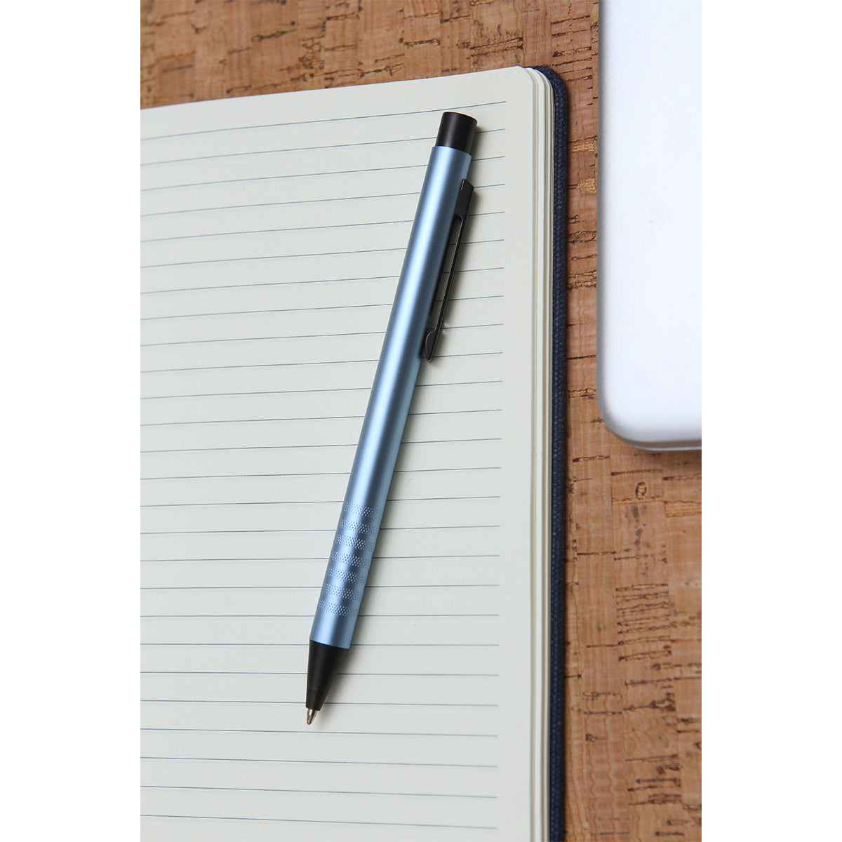 bolígrafo con barril de aluminio acabado mate, con diseño en la parte inferior de el bolígrafo, botón de plástico y clip metálico. tinta de escritura azul.