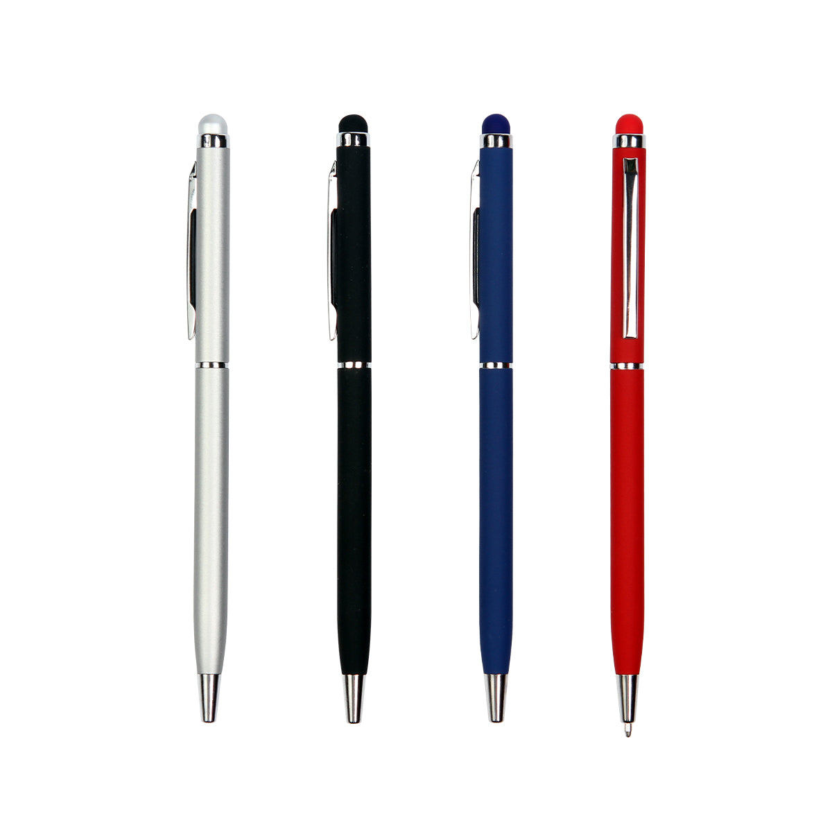 bolígrafo con barril de aluminio, clip metálico, punta plástica, con touch en la parte superior. tinta de escritura azul.