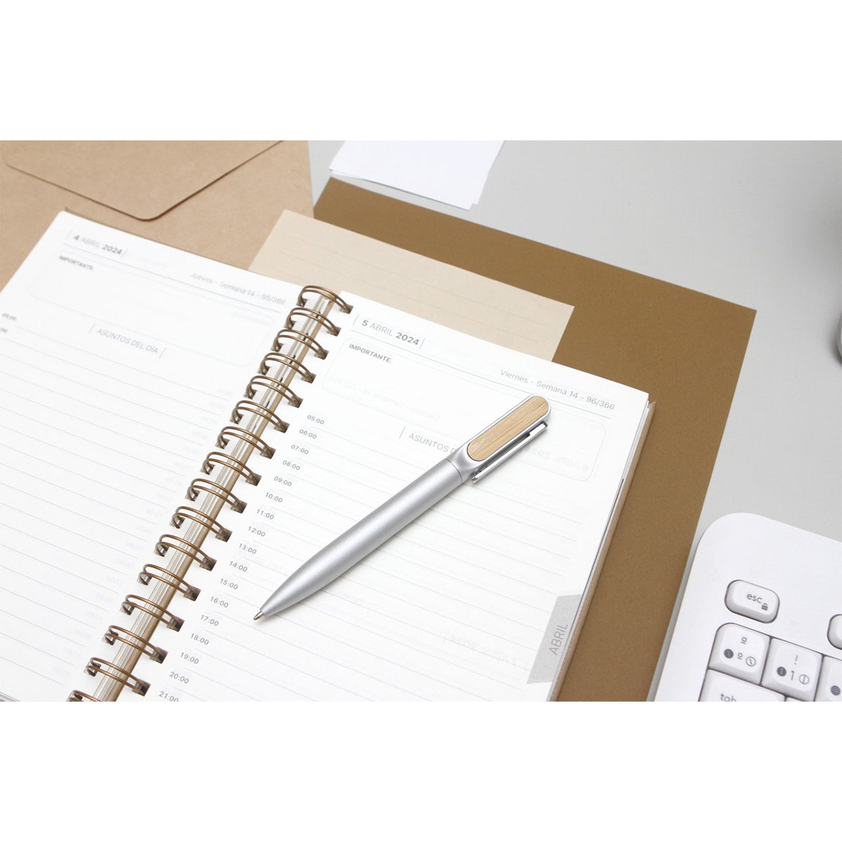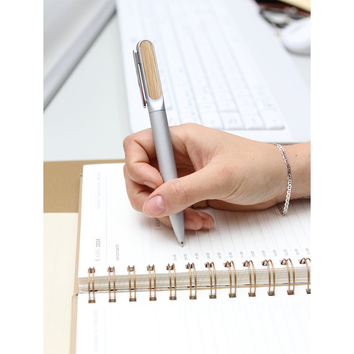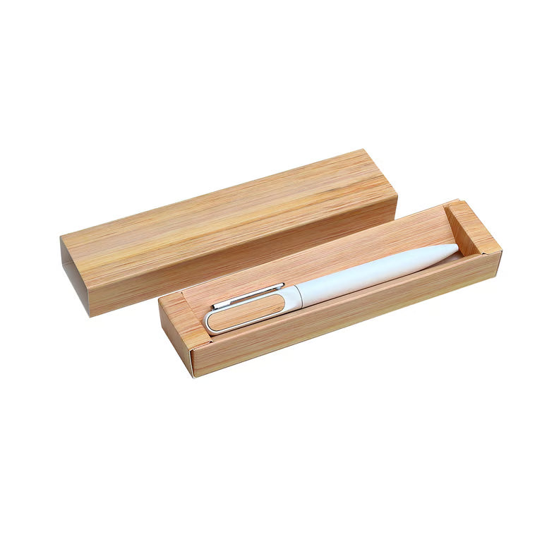 bolígrafo con barril de aluminio acabado mate y detalle superior en bambú. tinta de escritura negra. incluye caja de cartón individual con apariencia bambú.