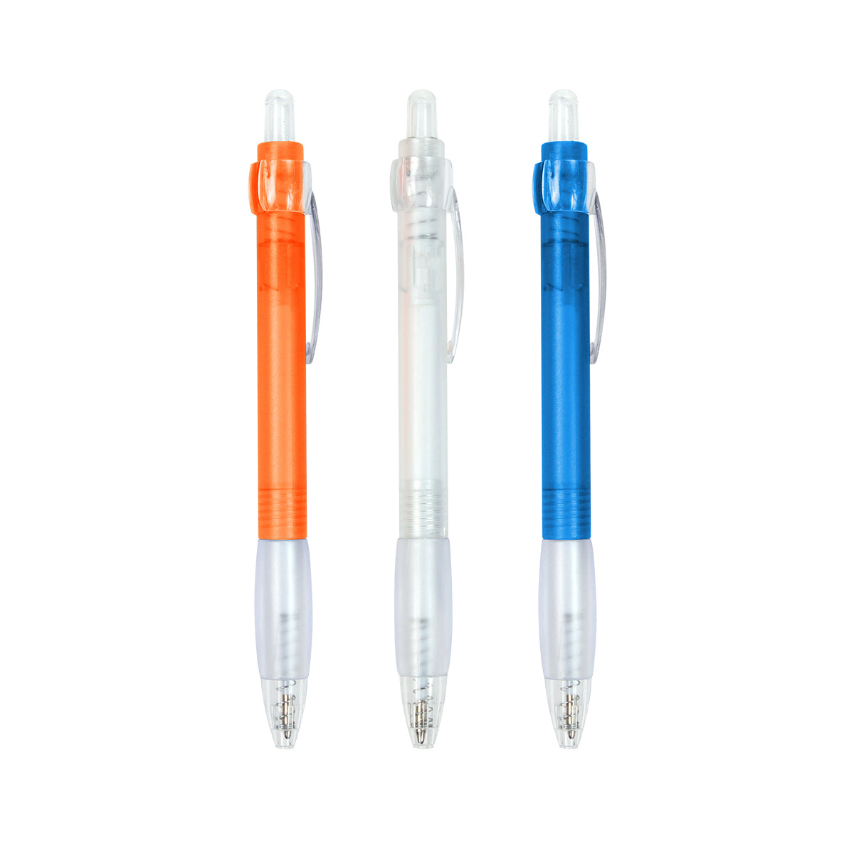 bolígrafo retráctil de plástico con grip y tinta negra, ligero y cómodo para una escritura suave y confortable.