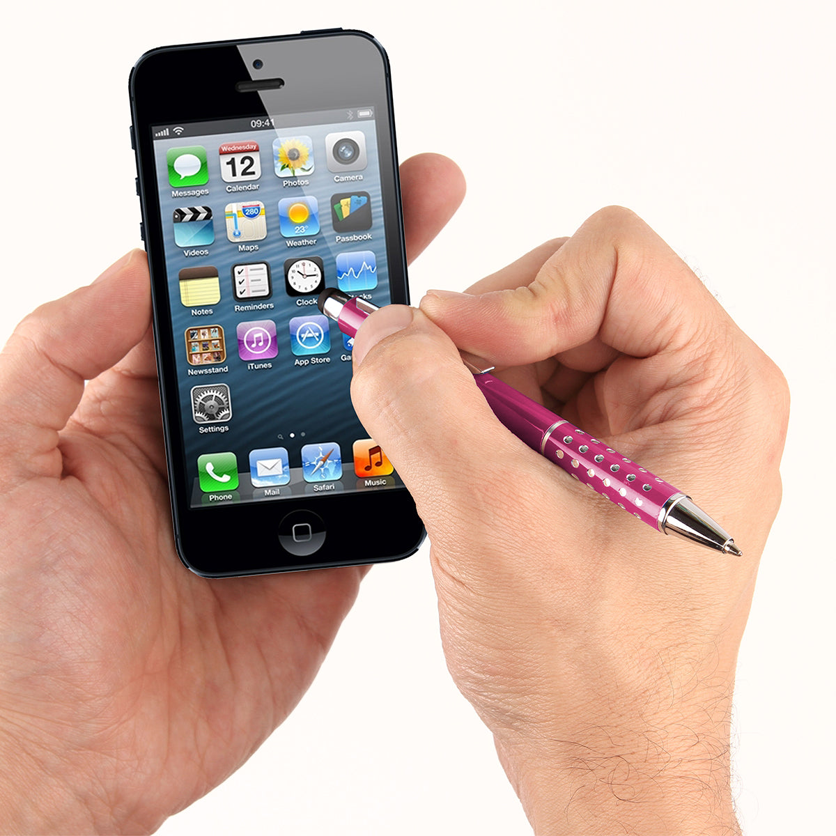 bolígrafo metálico con puntero touch, clip y punta con acabado metálico, detalle tipo piedra brillante en grip y estuche triangular de plástico transparente. tinta de escritura negra.