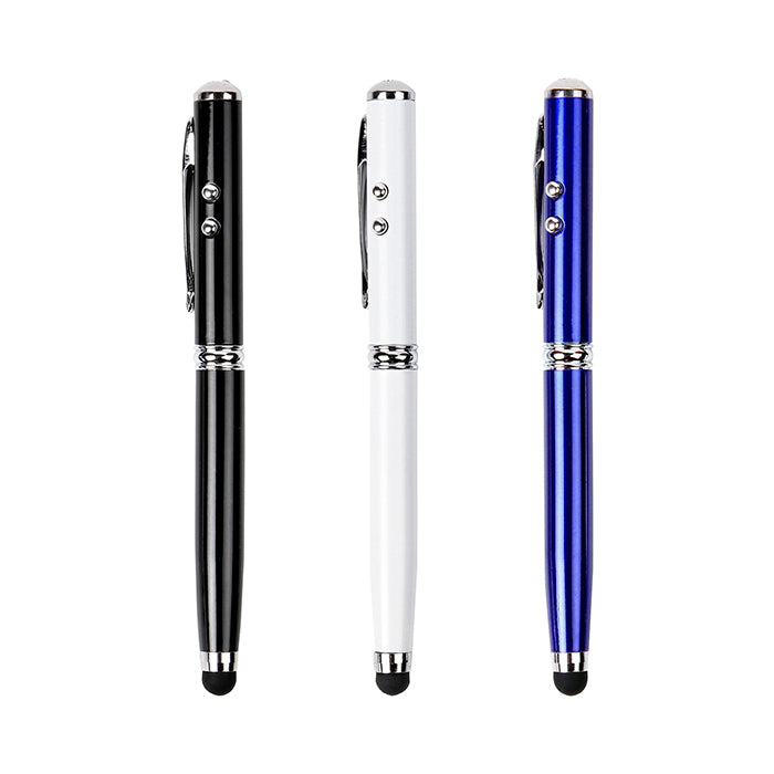 bolígrafo metálico con lámpara, señalador láser, puntero touch y detalles cromados. incluye estuche de plástico con base para fijar bolígrafo, tapa trasparente con imán para cerrar. tinta de escritura negra.
