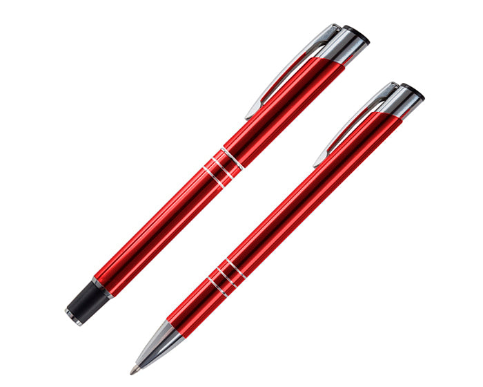 set de bolígrafos metálicos de tinta negra. un bolígrafo de punto fino tipo roller con tapa y un bolígrafo con mecanismo de click. incluye estuche plástico de forro aterciopelado en color gris y tapa transparente para la impresión de logotipo.