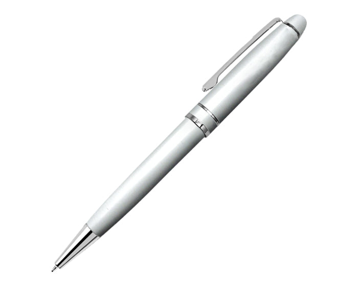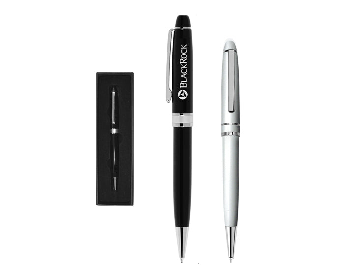 bolígrafo metálico, cintillo metálico, punta y clip de acero. mecanismo retráctil. presentación: caja en color negro.